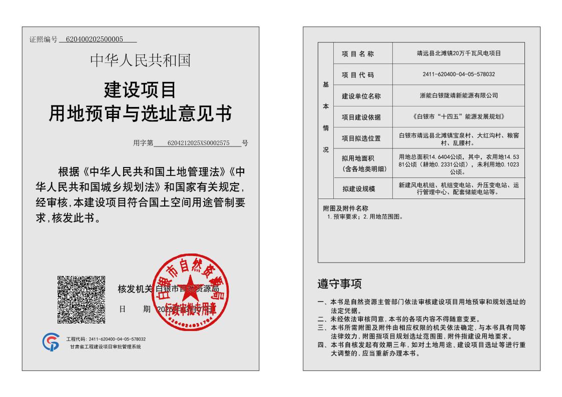 靖远县北滩镇20万千瓦风电项目建设项目用地预审与选址意见书