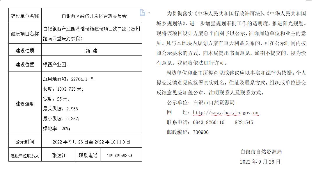 白银银西产业园基础设施建设项目次二路(扬州路南段重庆路东段)总平面公示公告