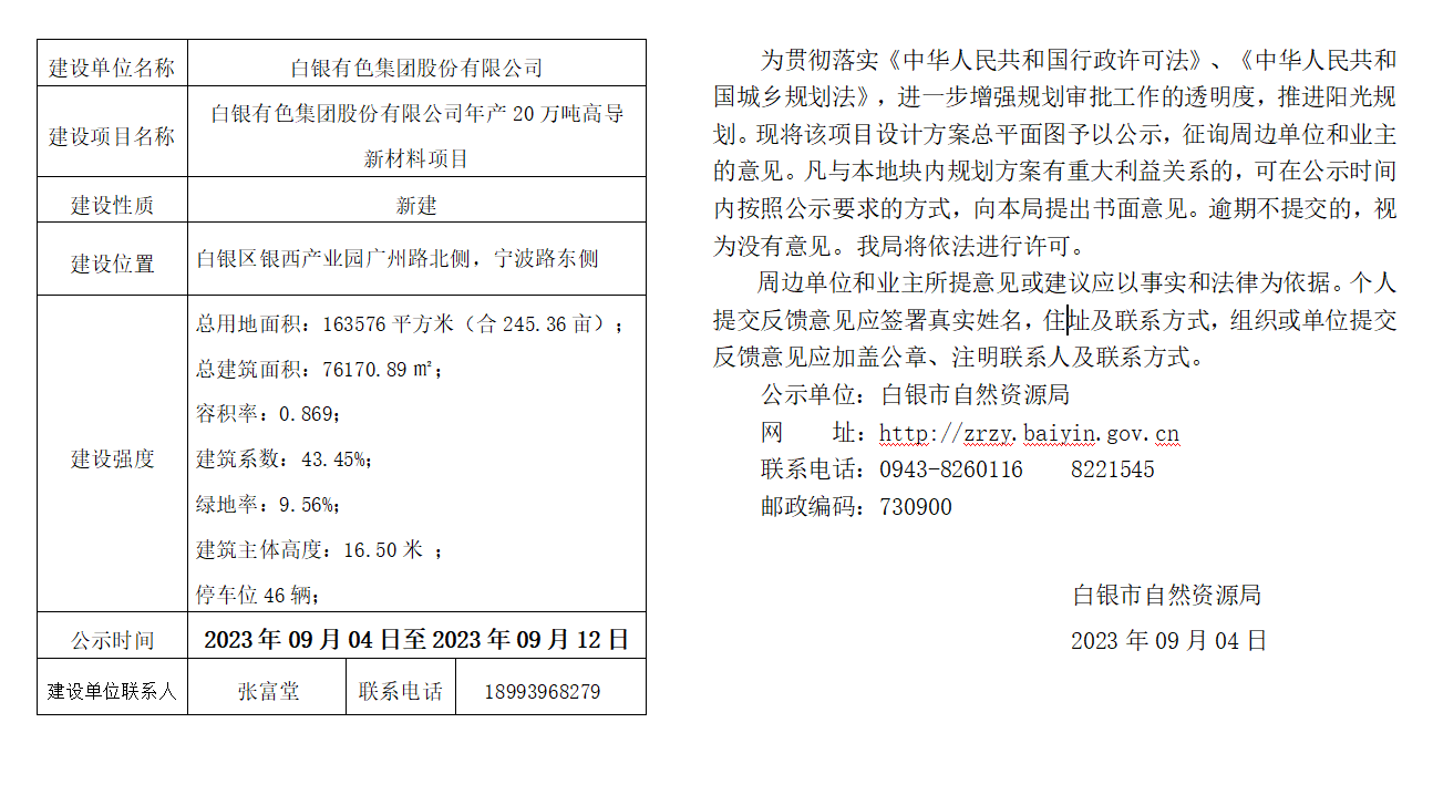 白银有色集团股份有限公司年产20万吨高导新材料项目总平面公示公告