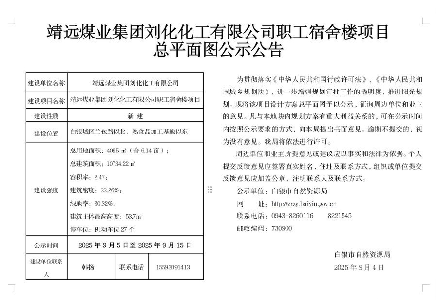 靖远煤业集团刘化化工有限公司职工宿舍楼项目总平面图公示公告