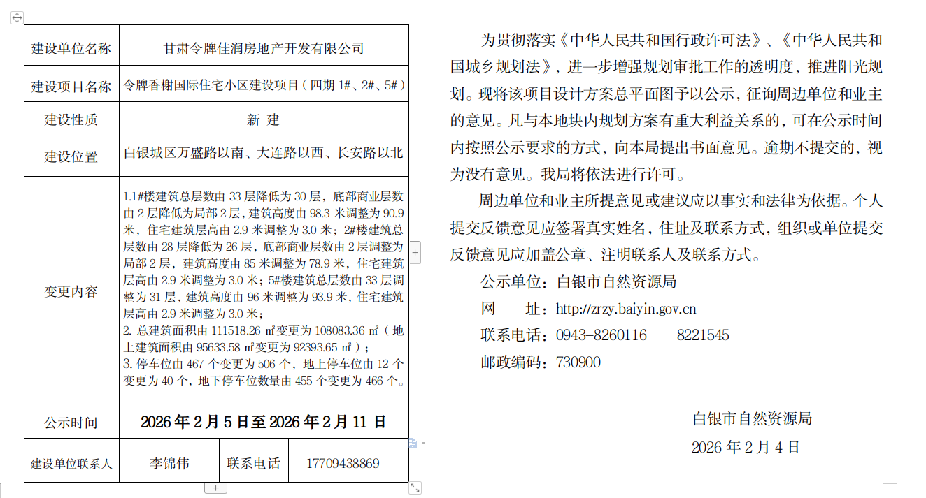 令牌香榭国际住宅小区建设项目(四期1#、2#、5#)总平面图变更公示公告