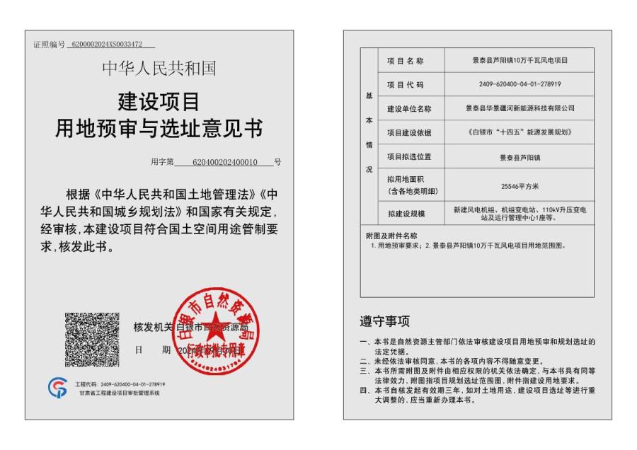 景泰县芦阳镇10万千瓦风电项目用地预审与选址意见书