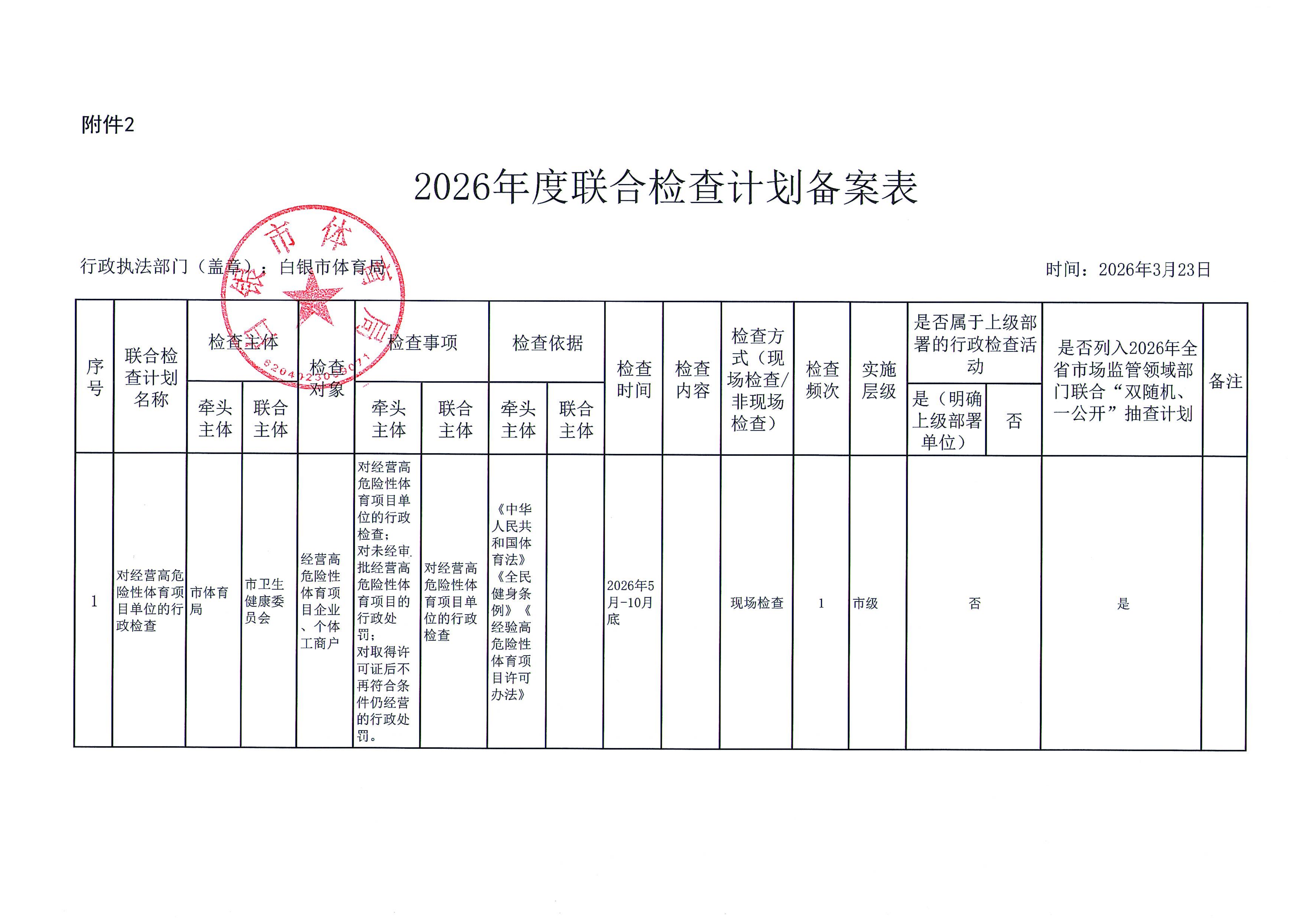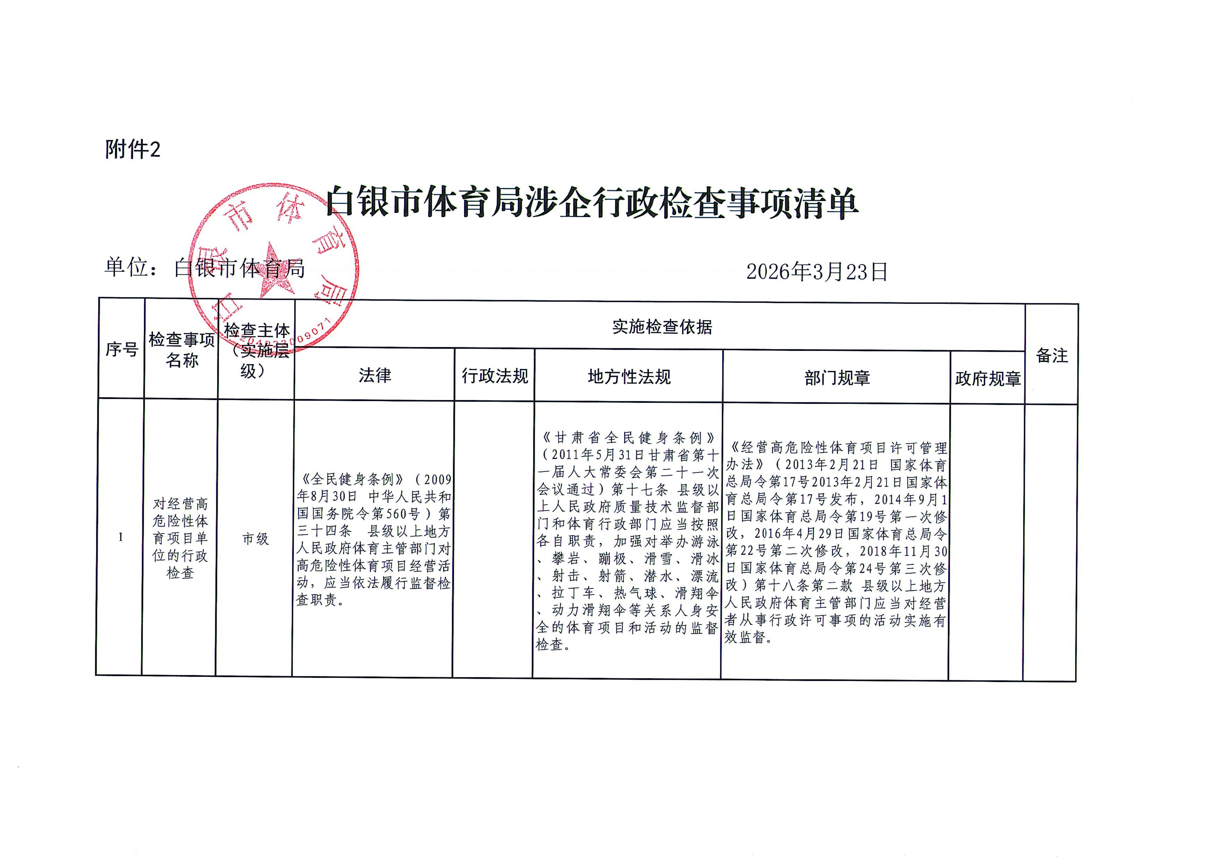 白银市体育局涉企行政检查事项清单及2026年度联合检查计划