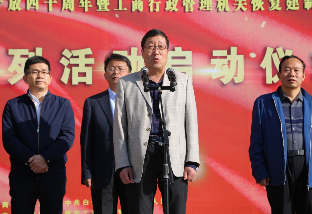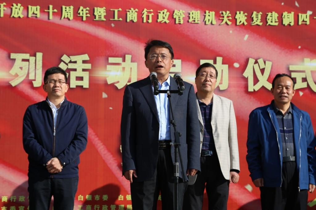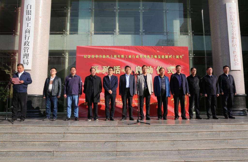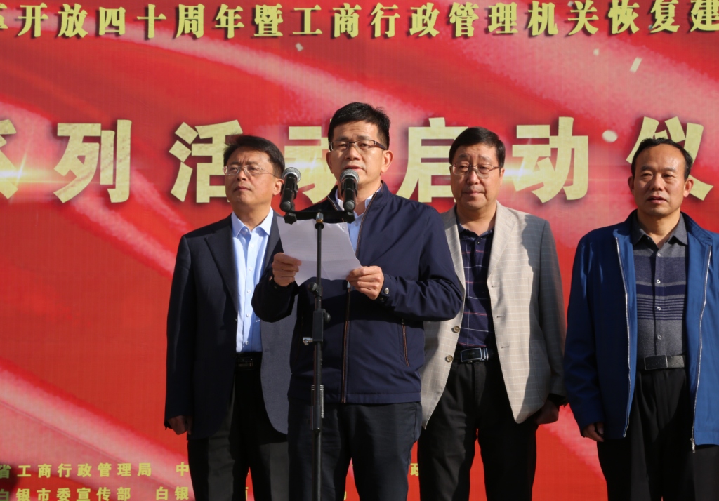 10月12日,白银市工商局庆祝改革开放40周年暨工商行政管理机关恢复建制40周年系列活动启动仪式举行。省工商局党组成员、副局长,中共甘肃省委非公有制经济组织和社会组织工作委员会副书记肖建胜出席活动并讲话,市委副书记、市委统战部部长齐永刚出席启动仪式并宣布系列活动正式启动,市政府副市长潘锐波出席活动并致辞,市政府副秘书长、办公室主任张国荣主持启动仪式。