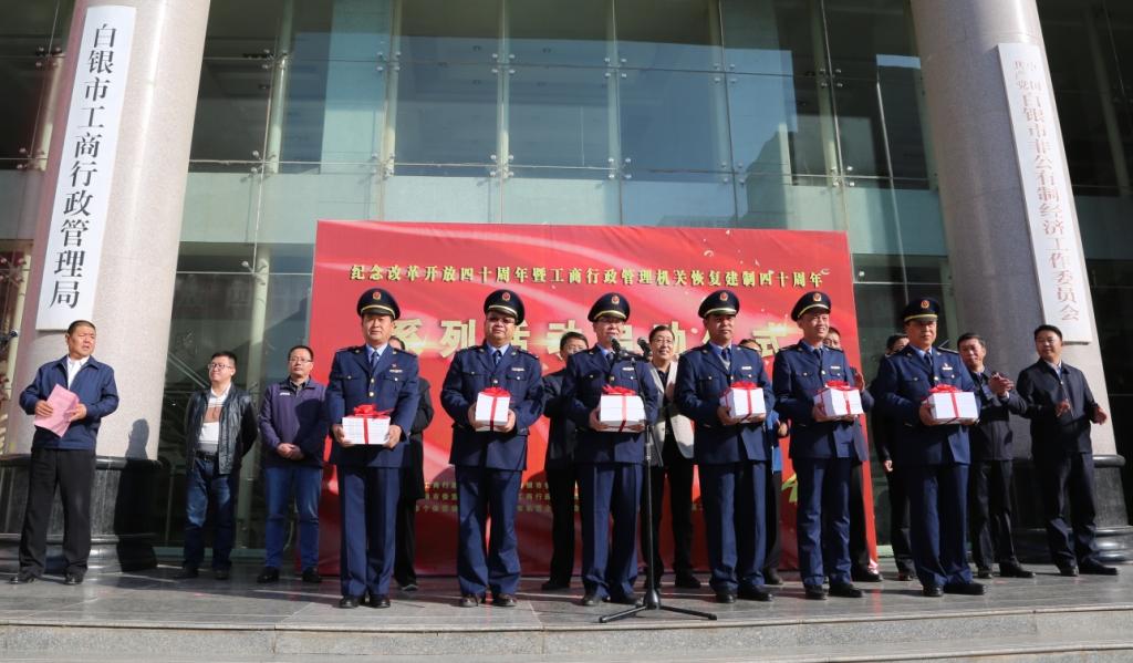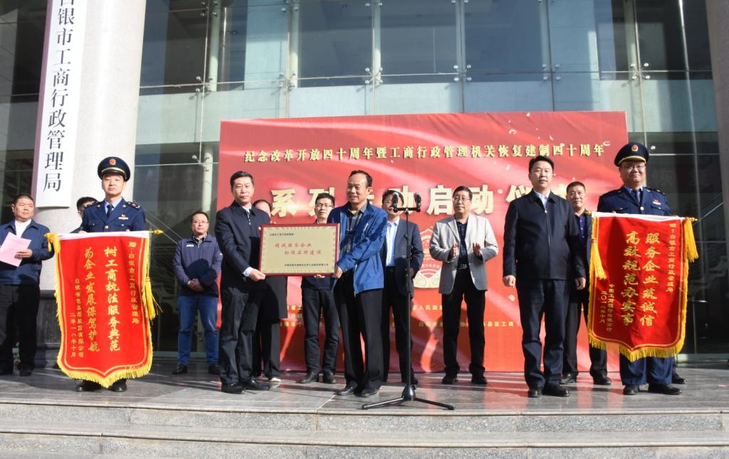 启动仪式上,白银有色集团股份有限公司、甘肃银光化学工业集团有限公司、中国工商银行白银分行向市工商局赠送牌匾和锦旗;参加活动的领导向各县区工商(质监)局、高新分局赠送了庆祝改革开放40周年暨工商行政管理机关恢复建制40周年宣传片及纪实文章书籍,并观看了《翰墨飘香书盛世 丹青溢彩谱华章》书画展。