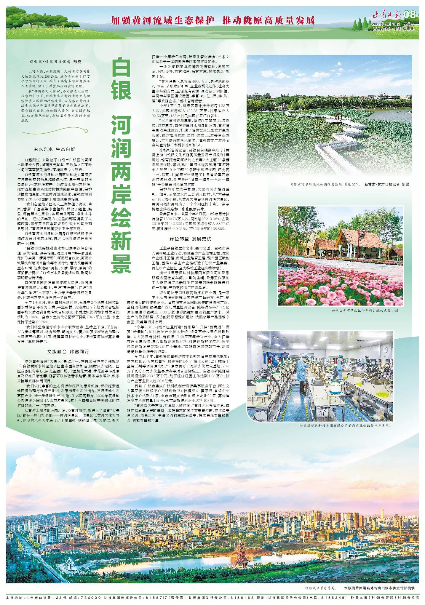 9月18日,《甘肃日报》报道,白银市立足黄河上游生态功能带重点区域的功能定位,认真落实黄河流域生态保护和高质量发展的重大战略决策,聚焦绿色赋能、打造绿色黄河、夯实绿色根基、壮大绿色经济,厚植高质量发展的亮丽底色。