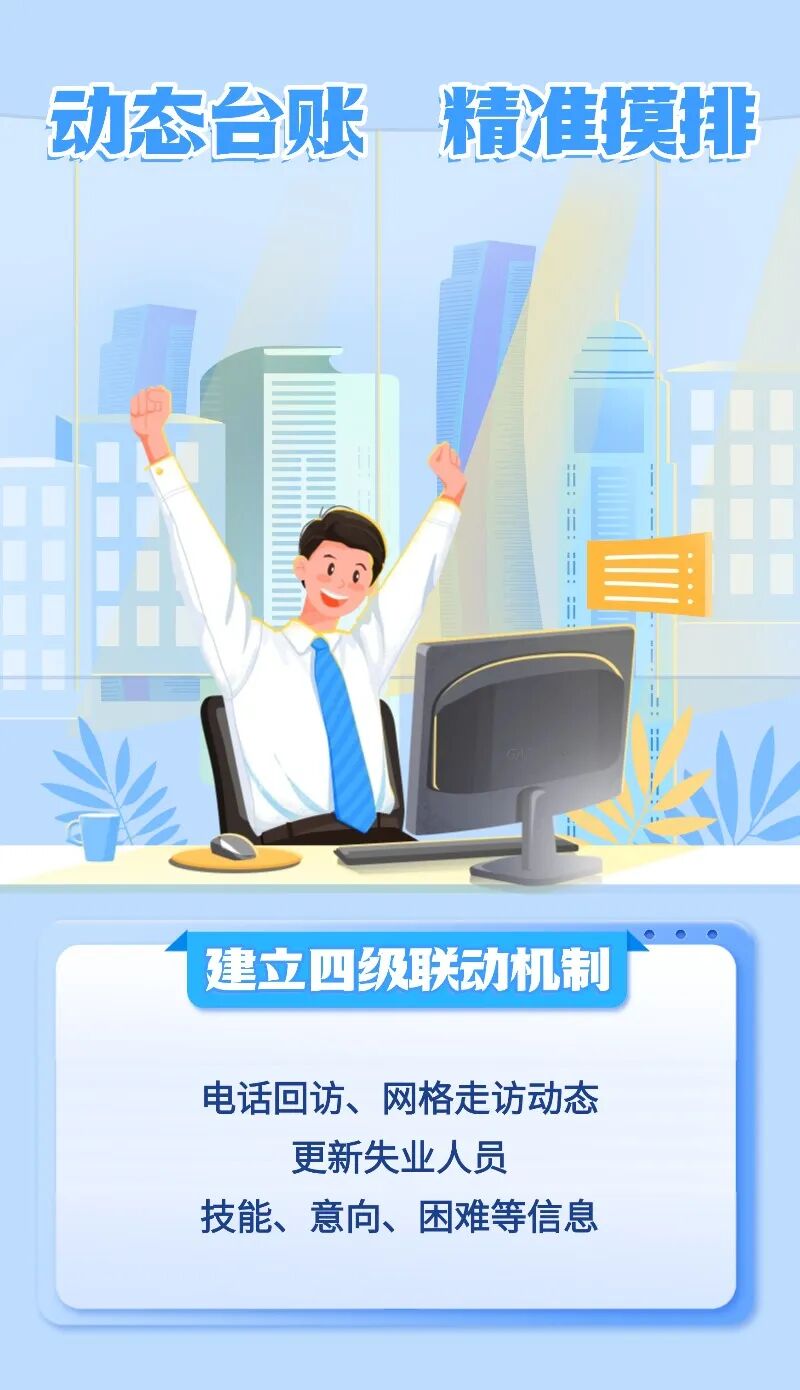 规范失业登记管理,建立《失业人员跟踪服务动态管理明细》,健全“市级统筹协调、县区分工落实、街道一线执行、社区兜底摸排”四级联动机制,通过定期电话回访、网格员常态化走访等方式,全面采集失业人员技能水平、就业意向、培训诉求及家庭实际困难等信息,动态实时更新台账数据,精准掌握失业群体状况。