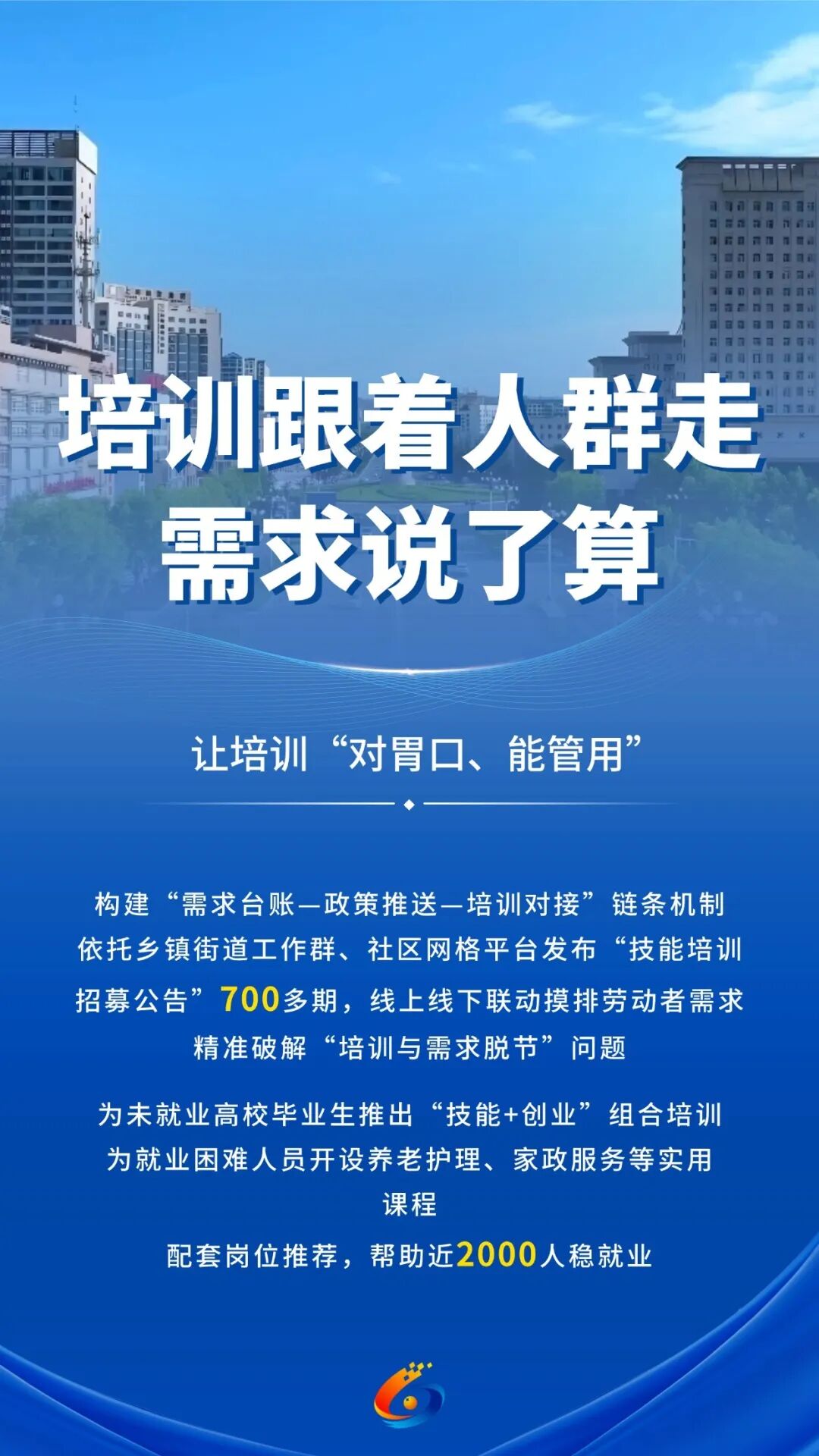 精准对接群体需求,定制培训套餐。坚持“培训跟着人群走、需求说了算”,通过多举措定制化服务,让培训“对胃口、能管用”。构建“需求台账—政策推送—培训对接”链条机制,依托乡镇街道工作群、社区网格平台发布“技能培训招募公告”700多期,线上线下联动摸排劳动者需求,精准破解“培训与需求脱节”问题。针对不同群体,分类施策破解就业难题。面向脱贫劳动力与农村转移人口,将农艺工、枸杞种植等课程搬到田间地头。为未就业高校毕业生推出“技能+创业”组合培训,覆盖电子商务等新兴领域,邀请企业高管开展案例教学。为就业困难人员开设养老护理、家政服务等实用课程,配套岗位推荐,帮助近2000人稳就业。