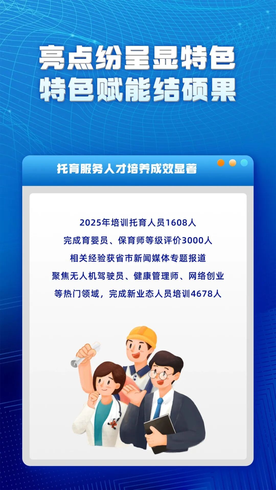 托育服务人才培养成效显著,2025年培训托育人员1608人,完成育婴员、保育师等级评价3000人,相关经验获省市新闻媒体专题报道。