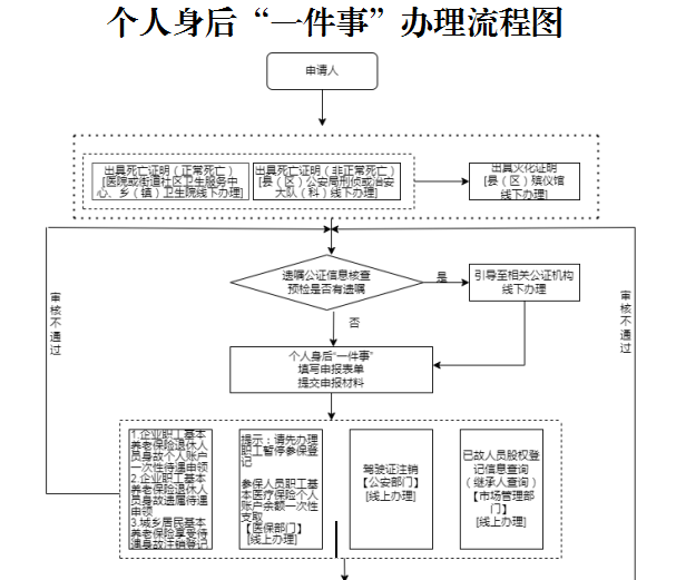 (一)做好前期基础工作。全面梳理个人身后“一件事”涉及单事项要素信息,厘清各部门职责权限,优化办事流程,编制办事指南(见附件1),精简办事材料。根据梳理形成的个人身后“一件事”资料清单(见附件2)和申请表(见附件3),对群众提交线上可办的联办申请,通过数据共享自动匹配用户信息,实现办事申请表单智能预填、材料自动核验及业务协同审批。配合做好“甘肃省人社公共服务平台”、“甘肃省医保公共服务平台”、“甘肃省住房公积金区域一体化共享协同平台”等业务平台与全省一体化政务服务平台对接,及时推送相关信息,实现死亡证明、火化证明、遗嘱公证、继承公证、社保医保提取、住房公积金提取、小额存款提取等业务数据互联互通。(市公安局、市民政局、市司法局、市人社局、市卫生健康委、市市场监管局、市医保局、市住房公积金管理中心、市大数据中心、市政务服务中心、白银金融监管分局按照职责分工负责,各县区人民政府落实。以下措施均需各县区人民政府及各责任单位落实,不再列出)