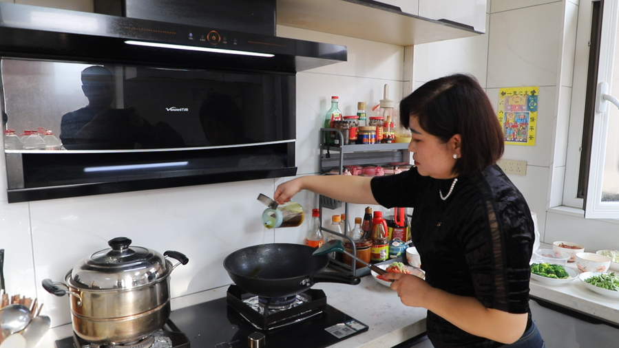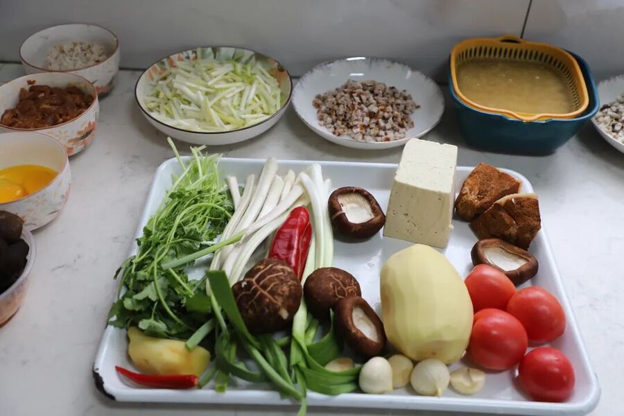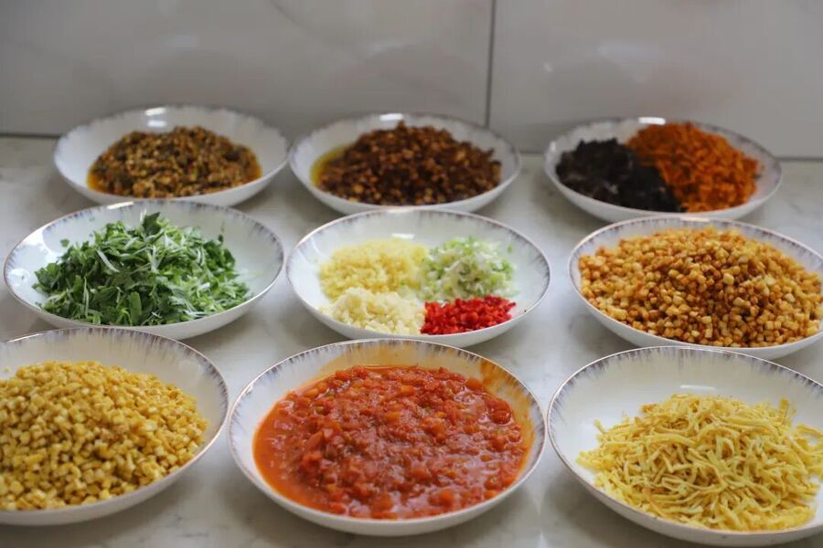 靖远臊子面的魅力,始于食材的精挑细选与前期的细致筹备。做臊子面,选料要实在,刀工要讲究,万立苹将提前卤制好的卤肉切成均匀的小丁,纯瘦肉不香,纯肥肉太腻,只有一定比例肥瘦肉分开进行煸炒,炒出来的臊子才醇厚入味。除了肉臊子,土豆、豆腐需经热油煎炸至金黄色,切成四方四正的小块;香菇切成丁后也需大火炒制;木耳泡发后切碎,虫草花切碎后更是增添鲜味。鸡蛋摊成薄饼后切成长丝;蒜苗和葱要切成形似“雀舌子”的细段,每一道食材的处理都暗藏功夫。