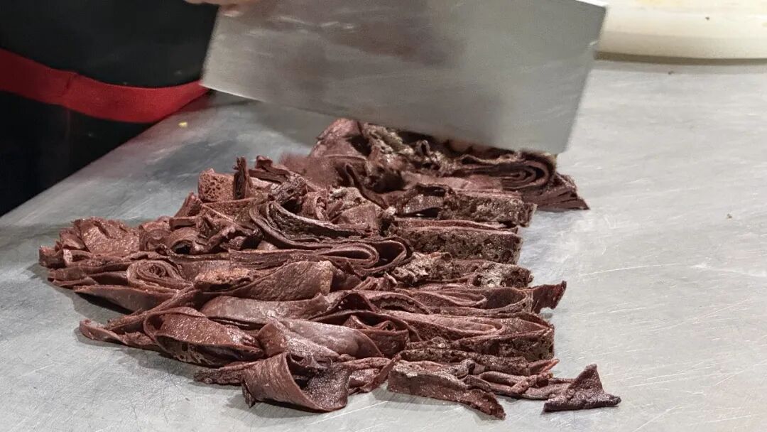 制作靖远炒血面,讲究“慢摊快炒”的功夫。选取新鲜猪血,与筛过的精细面粉一同放入陶盆,加入黄河水缓缓搅拌。平底铁锅烧热后刷上薄油,将面糊缓缓浇入,手持木勺沿锅壁轻轻一抹,一张薄如蝉翼、色泽暗红的血面饼便在文火中慢慢成形,边缘微微翘起时翻面,待两面熟透,起锅切成匀称的条状,静待与佐料的相遇。