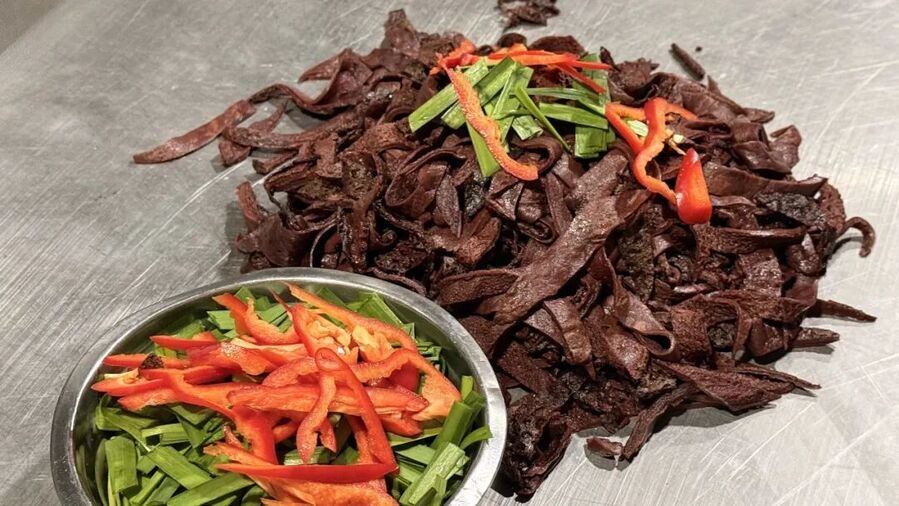 炒锅中热油,葱姜蒜爆香的瞬间,香气便弥漫整条街巷。倒入切好的血面,大火快速翻炒,让每一根面条都裹上油香。打一个土鸡蛋搅散淋入,蛋液迅速凝结,与血面交织出金黄与暗红的层次感。最后加入洗净切段的本地韭菜,翻炒数下,韭菜的清香与食材的鲜香完美融合,撒少许盐调味,一碗热气腾腾的靖远炒血面便出锅了。