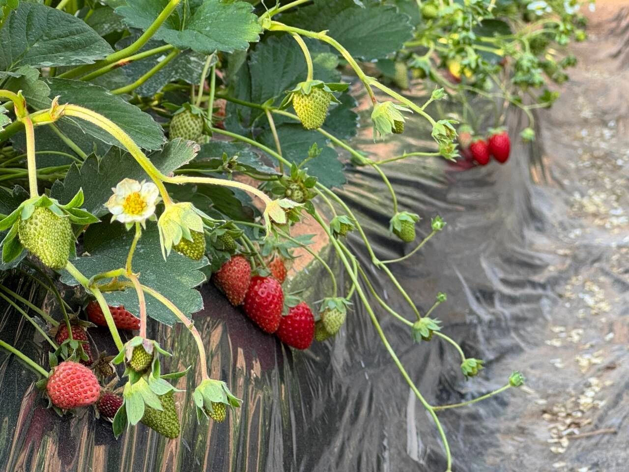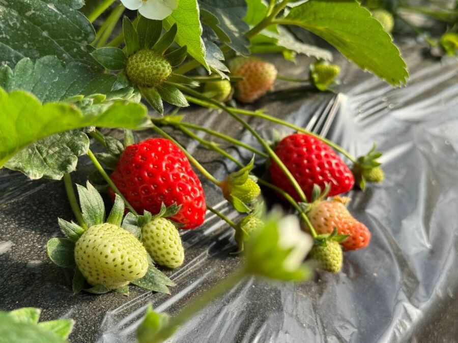 【七里香采摘园负责人 高小梅】我们采摘园已经三年了,种的有草莓、西瓜还有圣女果。这个草莓棚里面草莓是9月10号栽的,今年苗子是刘家峡拉来的,种的品种有妙香7号、有香野,一个是巧克力味的,一个是奶油味的。