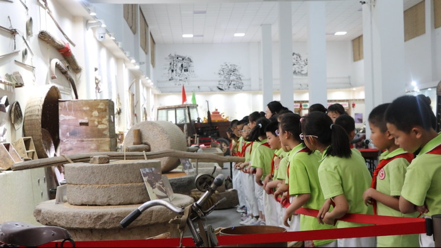 “大家看这里的农耕物品,这是劳动人民用智慧和汗水创造出灿烂的农耕文明。”学生市民们随着讲解员的介绍,穿梭在博物馆里,仔细观察展厅内的展品,沉浸在铜城民俗文化中。除了青瓷、老井等“老”物件,电台、电视、电影、电话等“新”物品一应俱全,尤其是铁牛55拖拉机,印证着新中国成长的荣光,大家纷纷驻足观赏,了解这些物件背后的故事。