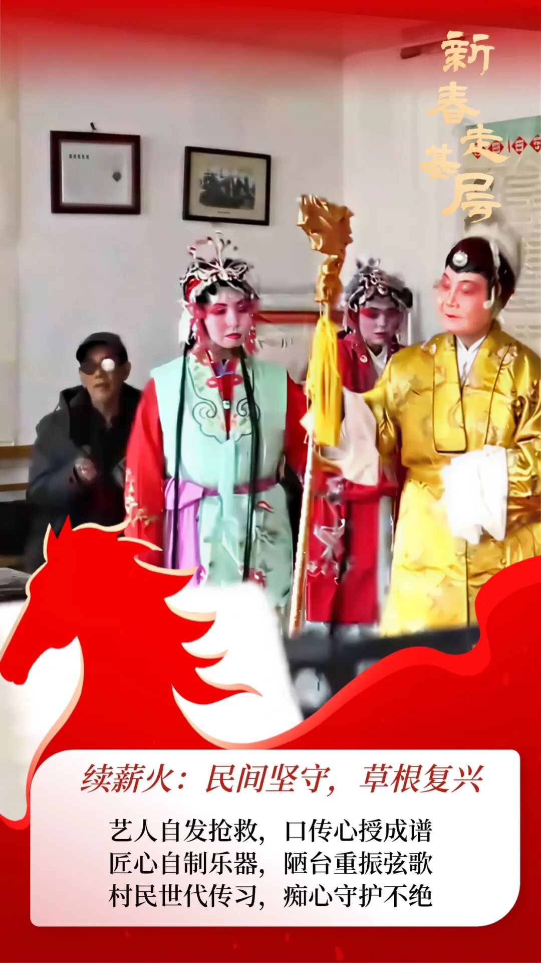 守正之余,创新不止。团队补全了《西厢记》剧本,新增《悔婚》《送别》《团圆》三折,让古典爱情故事更加完整。更可贵的是,他们将目光投向当下——《古渡新村》唱响乡村振兴,《乡愁》勾勒游子情怀,《田野希望》描绘农耕新景。古老曲调装载时代心声,文明乡风、移风易俗等主题,通过百年旋律悄然浸润人心。
