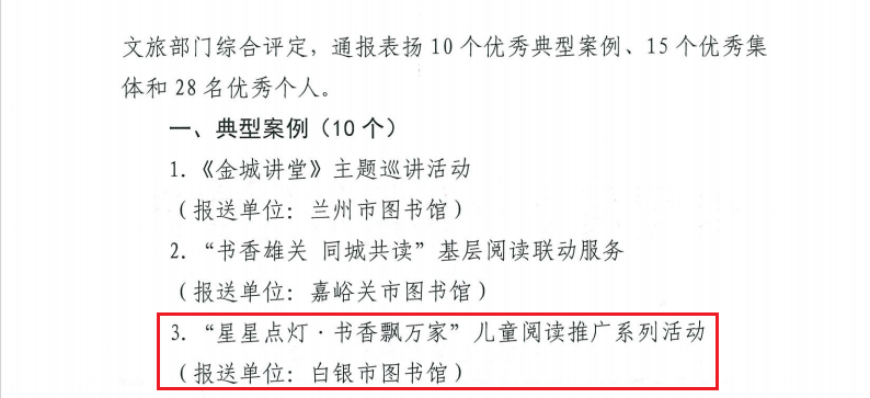 利用第五届“陇韵书香季”省级活动载体,白银市图书馆紧盯少儿读者这一关键群体,精心策划推出“星星点灯·书香飘万家”儿童阅读推广系列活动,并在全省评选中荣获优秀典型案例。
