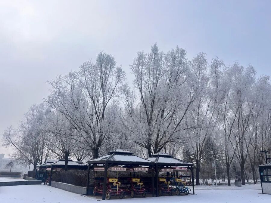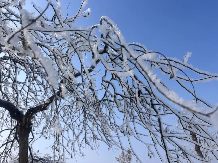 树枝上挂满晶莹剔透的雾凇,在阳光映照下闪烁着迷人的光芒,白银的冬季宛如被施了魔法的童话世界。