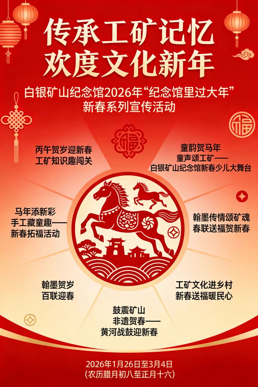 这个春节,白银文旅邀您一起,走进纪念馆,过个“不一样”的文化年:沉浸式探馆,触摸工业历史的脉搏;亲子互动体验,让孩子在玩乐中传承文化;笔墨送福,把传统年味带回家;文艺展演,感受工矿精神与童真交融。在历史的厚重中,感受文化的温度,在红火的年味里,触摸奋斗的精神。