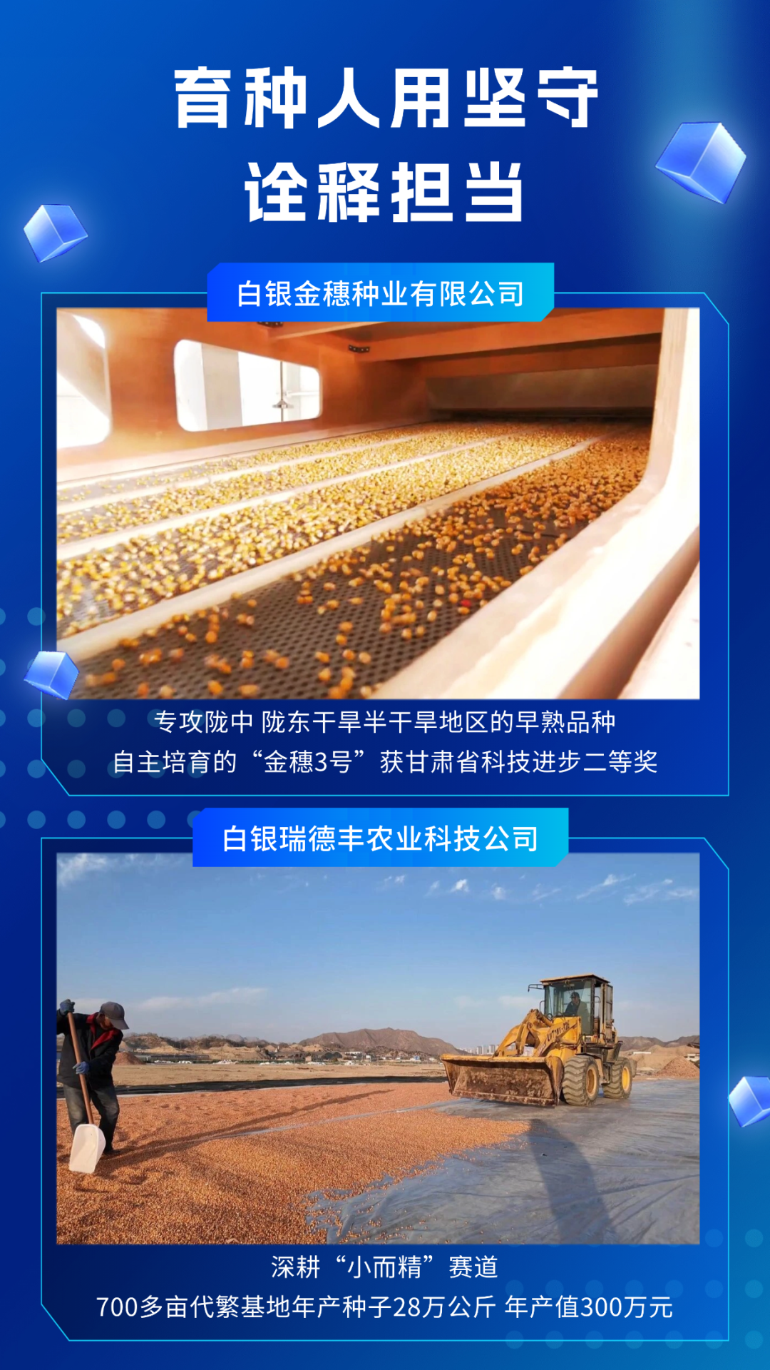 种业是农业的“芯片”,白银区的育种人用坚守诠释担当。白银金穗种业有限公司是一家扎根当地30年的企业,专攻陇中、陇东干旱半干旱地区的早熟品种,自主培育的“金穗3号”获甘肃省科技进步二等奖,2000亩繁育基地年产种子80万公斤,可覆盖40万亩播种面积。“我们的种子是旱作区农户的‘救命种’,极端天气也能保收成。”该公司副总经理梁柱说。