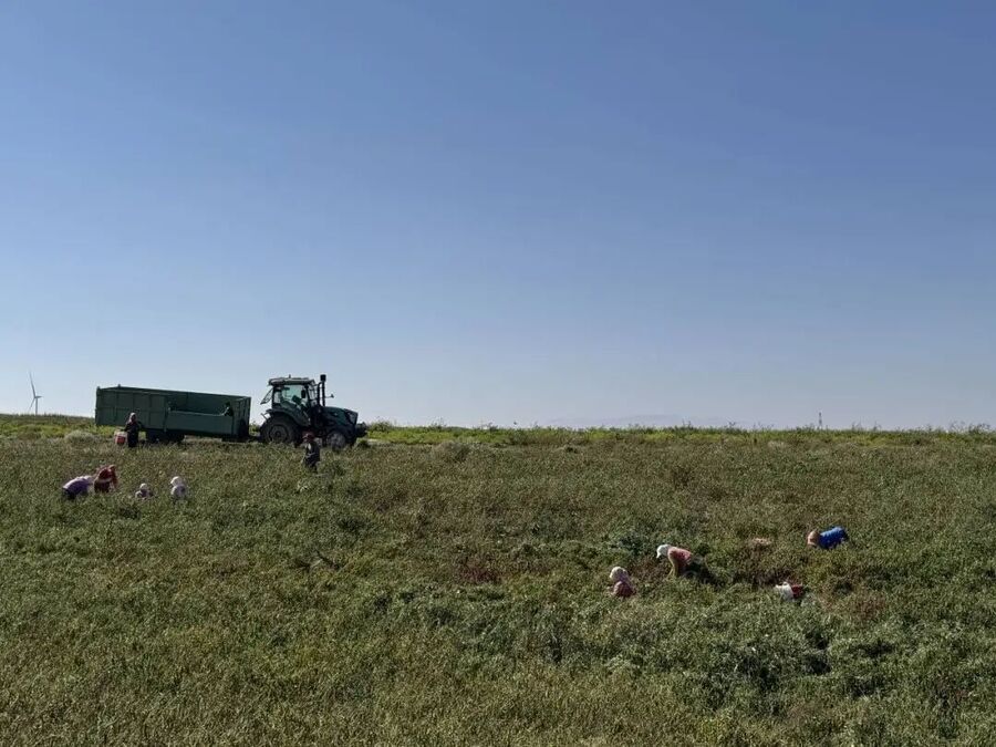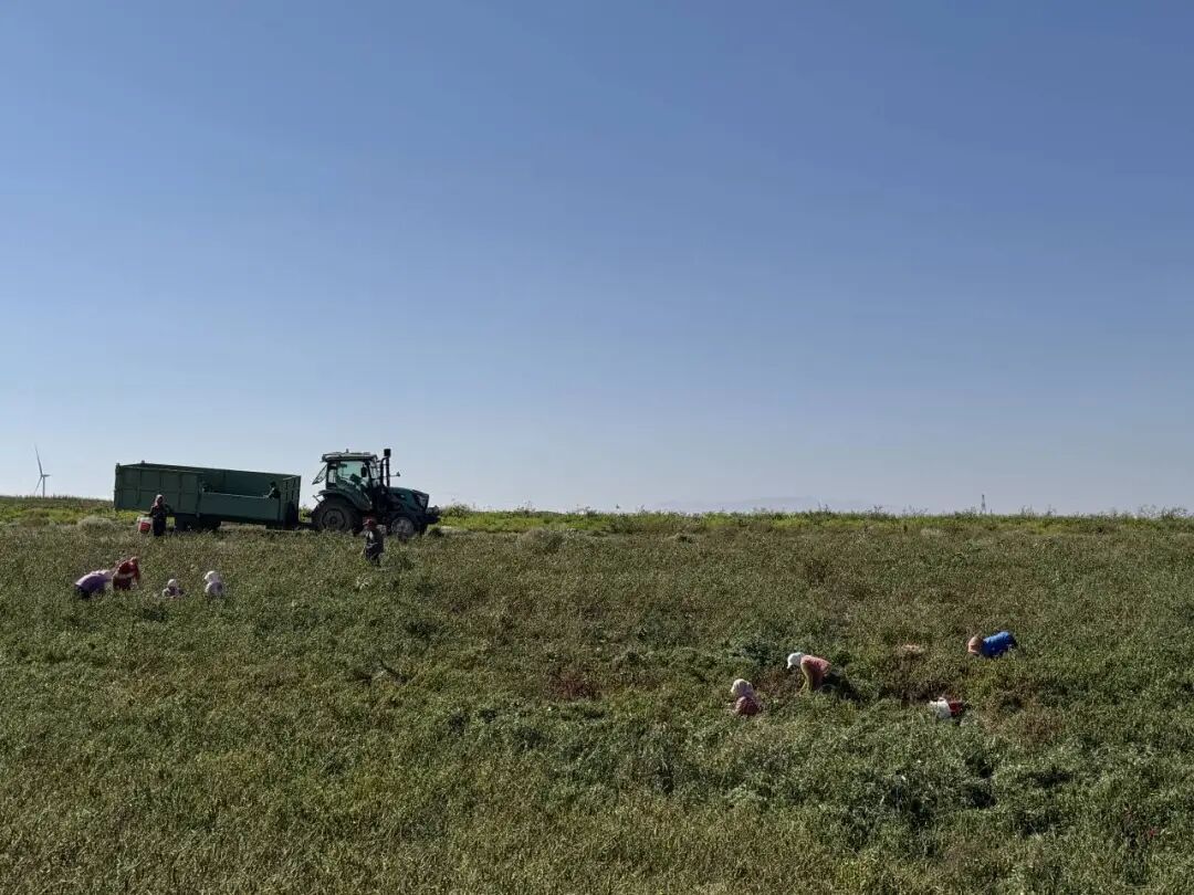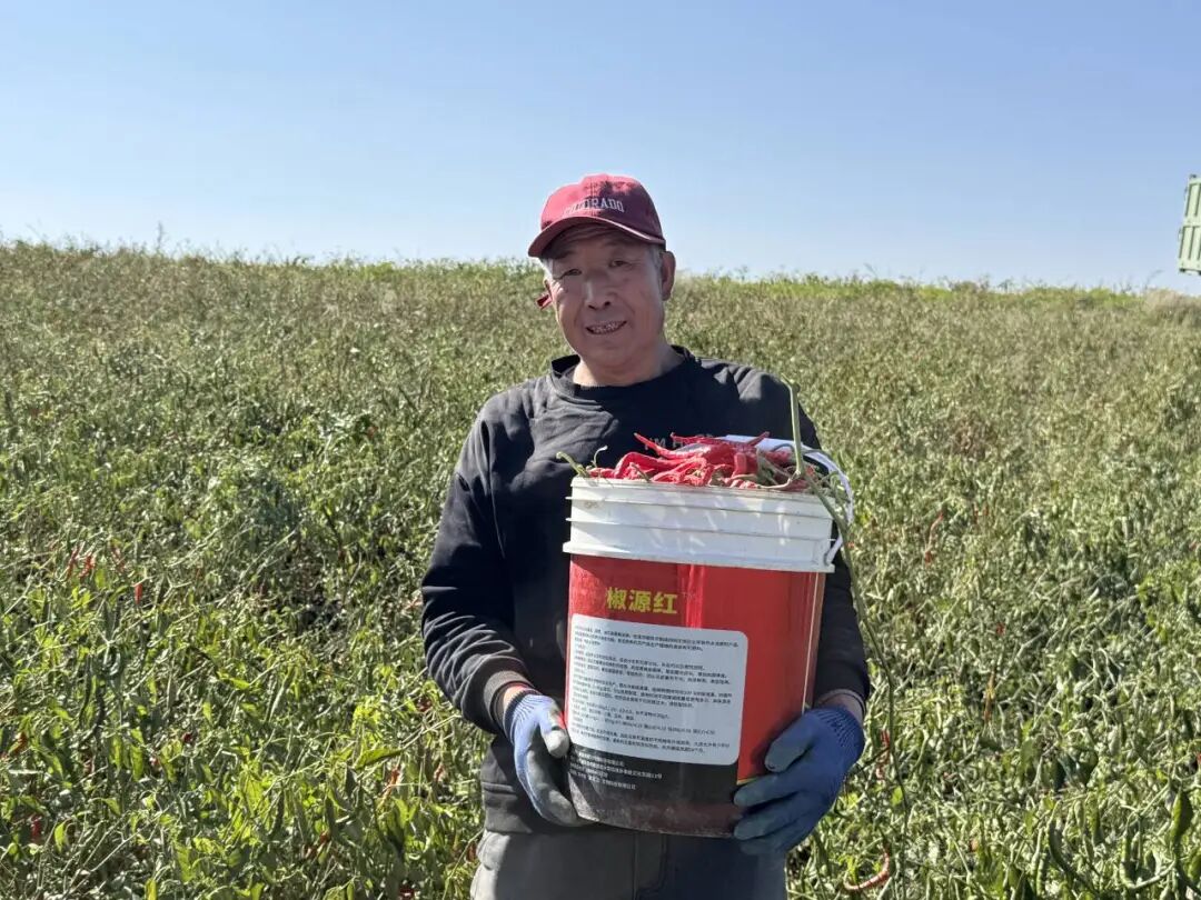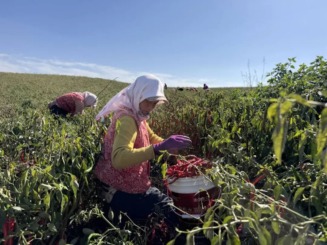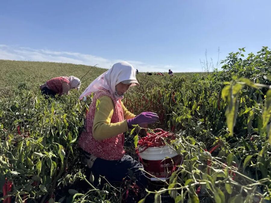 基地采收现场,数十名工人正分散在田间忙碌采收。有的蹲在辣椒丛中,熟练地将成熟的辣椒采摘入桶。有的提着一桶桶满当当的辣椒,在田间穿梭运送。