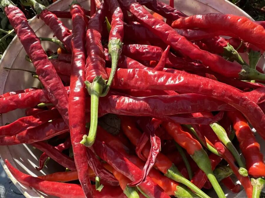 【基地务工人员 王成中】听说这个东升的辣子好得很,我们从五合专门来摘辣子,早上有露水呢,10点了过来摘辣子,摘到现在已经摘了60桶子了。