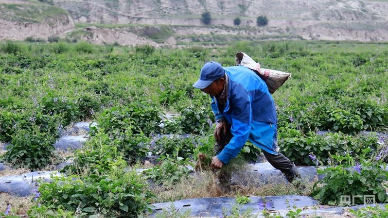 种植丹参的农民正在除草(央广网发 王文成 摄)