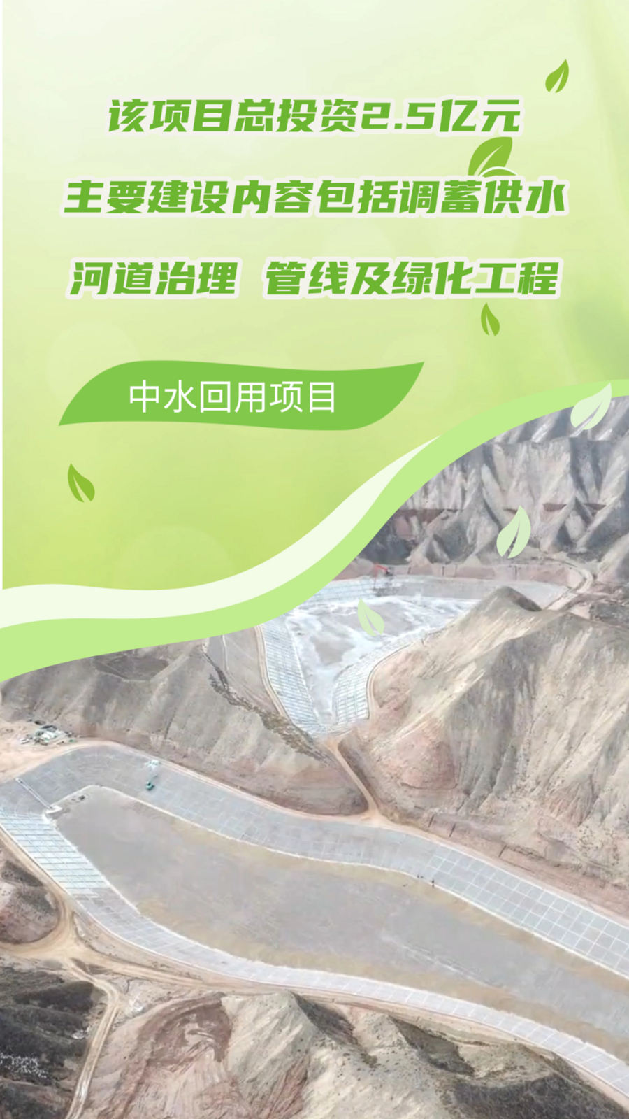 据了解,该项目总投资2.5亿元,主要建设内容包括调蓄供水工程、河道治理工程、管线工程及绿化工程。白银区水利建管站站长王彦东说:“项目收集白银市污水处理厂达标排放以后的中水,进入王岘尾水湿地以后进行二次处理,再由管道进行收集进入调蓄水池,最后通过加压泵站向周边的荒山绿化苗木进行供水。”