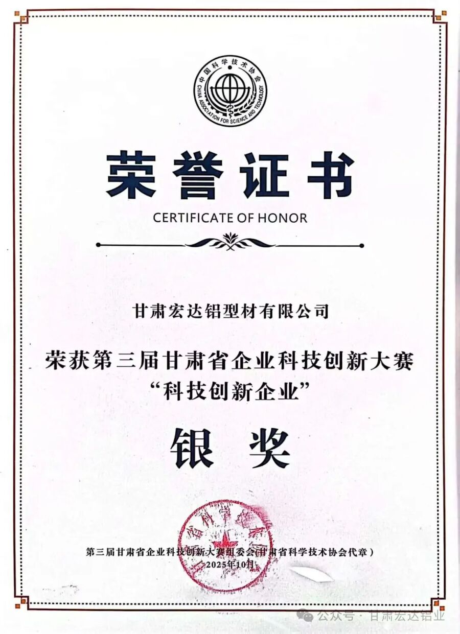 近日,第三届甘肃省企业科技创新大赛结果揭晓,白银区本土企业甘肃宏达铝型材有限公司(以下简称:宏达铝业)凭借强劲创新实力斩获“科技创新企业” 银奖,成为白银市唯一获此殊荣的企业。这一荣誉不仅是企业深耕科技的见证,更折射出白银区近年来以科技为笔,为企业高质量发展绘就的生动图景。