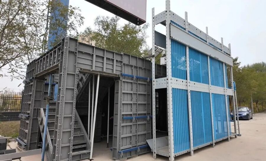 走进宏达铝业生产厂区,一组铝模板与铝爬架产品格外引人注目。