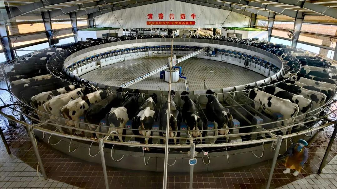 走进甘肃晨光前进牧业有限公司的智能挤奶厅,一派高效有序的现代化生产景象扑面而来。80位转盘式挤奶机匀速转动,红色的数据采集信号灯不停闪烁,一头头奶牛,在工作人员的轻柔引导下,不慌不忙地步入专属卡位,开启每日的产奶流程。