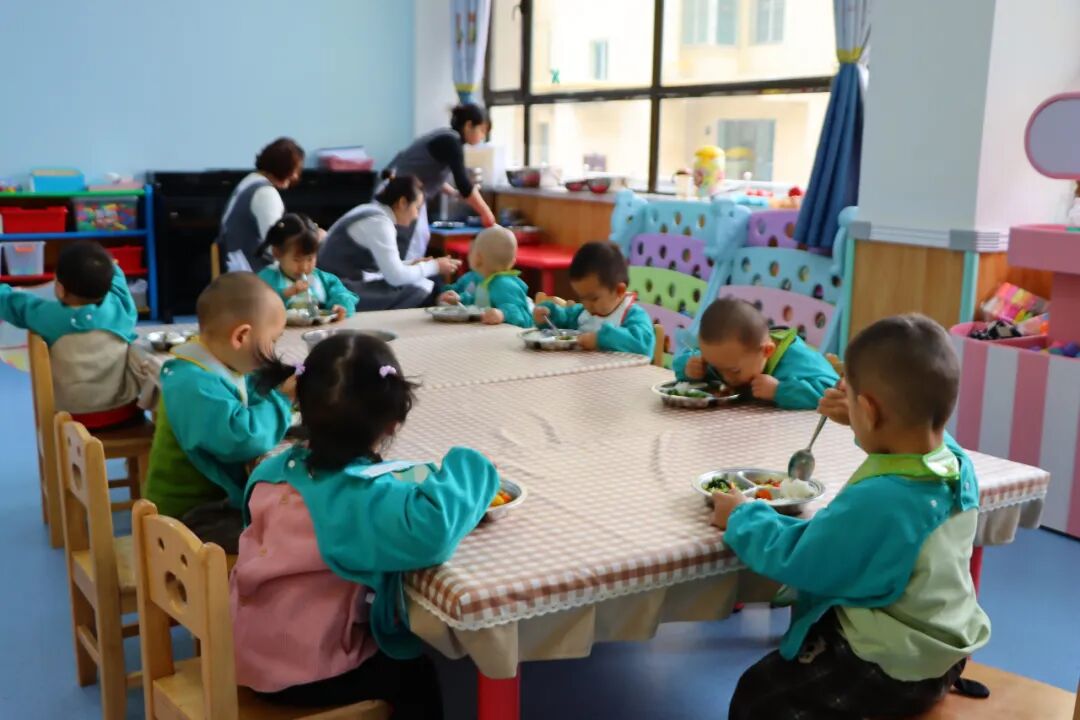 一番尽情嬉戏后,午餐时间到了。餐桌上,保温餐盘里的餐点丰富多样,荤素搭配均衡,诱人的香气直钻鼻腔,老师温柔叮嘱大家慢慢吃。对于年纪小的宝宝,老师细心地喂到嘴边。