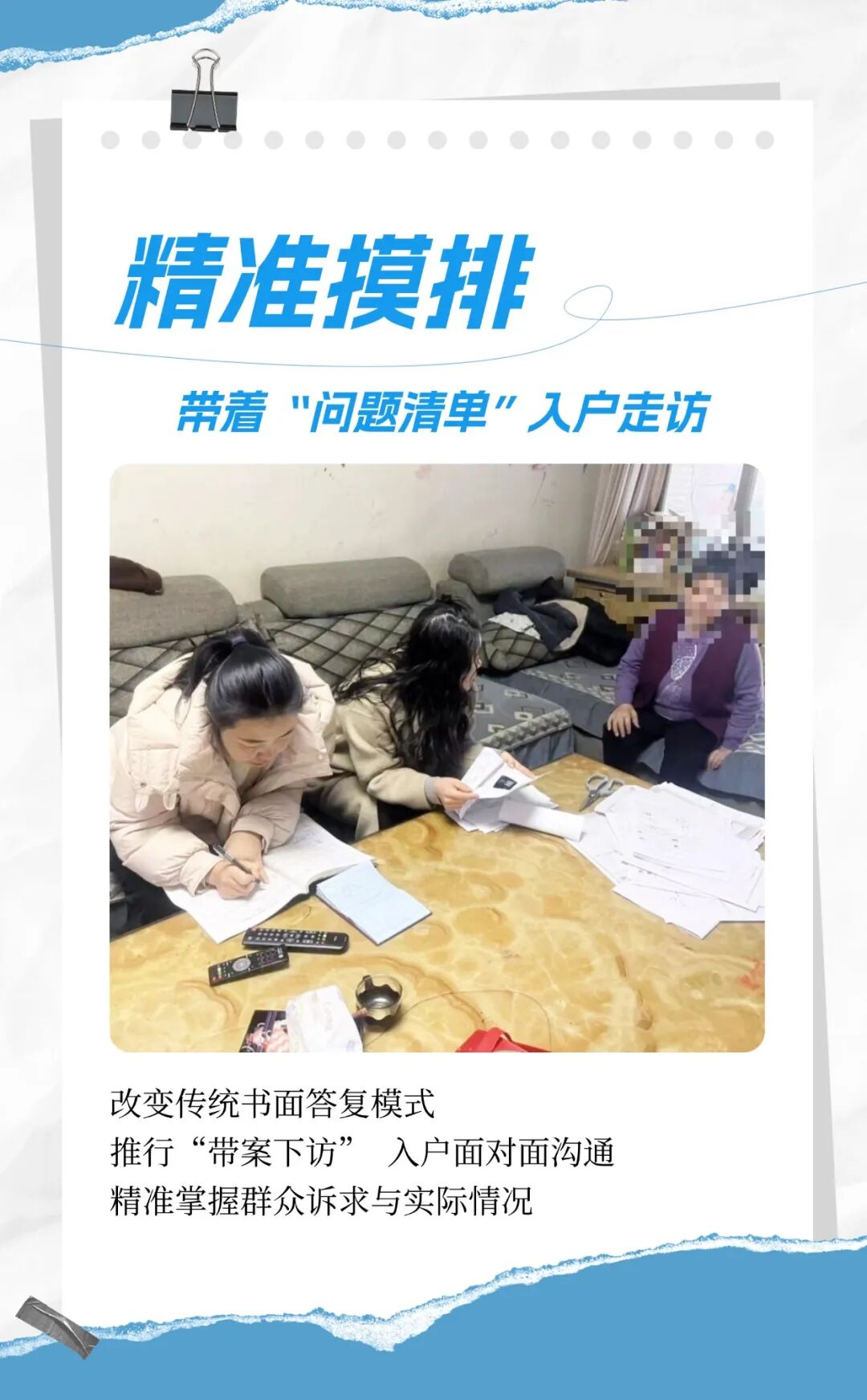 景泰县社会救助中心聚焦群众反映集中的低保申请未通过、救助政策落实不精准等信访事项与举报案件,通过信访系统、政务服务热线等渠道进行全面梳理筛查,建立重点难点户台账。一改以往书面答复的单一模式,创新采取“带案下访”形式,工作人员逐户登门,与群众面对面沟通交流,精准倾听真实诉求、摸清实际情况。