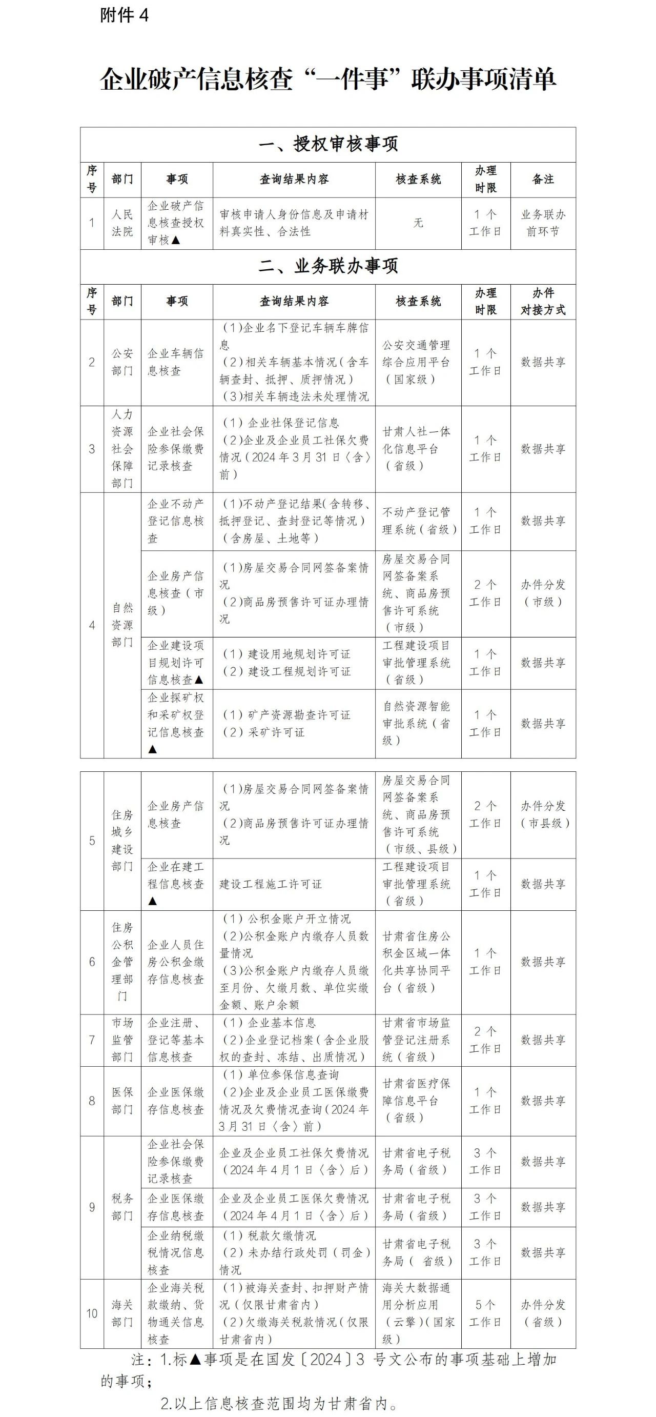 一、制定背景 为深入贯彻国务院、省政府关于进一步优化政务服务提升行政效能推动“高效办成一件事”决策部署,全面落实市政府“高效办成一件事”实施方案有关要求,深入推动政务服务提质增效,实现办事方式多元化、办事流程最优化、办事材料最简化、办事成本最小化,最大限度利企便民,激发经济社会发展内生动力的总要求,制定印发《白银市高效办成企业破产信息核查“一件事”工作方案》。 二、政策依据 《国务院关于进一步优化政务服务提升行政效能推动“高效办成一件事”的指导意见》(国发〔2024〕3号)、《国家市场监管总局等八部门关于进一步优化政务服务提升行政效能推进“高效 办成一件事”的实施意见》(国市监注发〔2024〕57号)、《甘肃省人民政府关于进一步优化政务服务提升行政效能推动“高效办成一件事”实施意见》(甘政发〔2024〕20号)、《白银市人民政府办公室关于印发白银市进一步优化政务服务提升行政效能推动“高效办成一件事”实施方案的通知》(市政办法〔2024〕47号)。 三、起草过程 认真贯彻落实国务院、省、市推动“高效办成一件事”决策精神,学习领会、参照执行《甘肃省高效办成企业破产信息核查“一件事”工作方案》。积极向上级相关部门联系汇报,主动加强与同级相关部门沟通协调,结合白银市实际,起草了《白银市高效办成企业破产信息核查“一件事”工作方案(征求意见稿)》,并向人民法院、公安、人社、自然资源、住建、医保、住房公积金管理中心、政务服务中心、大数据中心、税务等部门多次征求意见建议。经修订完善相关内容,制定印发了《白银市高效办成企业破产信息核查“一件事”工作方案》。 四、内容综述 《白银市高效办成企业破产信息核查“一件事”工作方案》包括四部分主要内容及五个附件。 (一)主要内容 第一部分:总体目标。进一步优化企业破产信息核查办事流程,依托全省一体化政务服务平台等业务系统支撑能力,通过强化机制创新、业务协同、数据共享等方式,统筹推进全市各相关部门企业破产信息核查工作,实现企业破产信息核查“一件事”改革落地见效,形成线下办事“只进一门”、线上办事“一网通办”、企业和群众诉求“一线应答”的“三个一”办理模式,促进服务能力整体提升,并保持常态化推进,大幅提升企业和群众办事满意度、获得感。 第二部分:工作内容。进一步明确了企业破产信息核查“一件事”的事项名称、事项范围、适用范围、适用对象。企业破产信息核查“一件事”包括:企业车辆信息核查;企业不动产登记信息核查;企业建设项目规划许可信息核查;企业探矿权和采矿权登记信息核查;企业社会保险参保缴费记录核查;企业注册、登记等基本信息核查;企业医保缴存信息核查;企业房产信息核查;企业在建工程信息核查;企业人员住房公积金缴存信息核查;企业纳税缴税情况信息核查;企业海关税款缴纳、货物通关信息核查等事项。核查对象为企业法人。适用对象是人民法院确定的破产管理人、清算组。 第三部分:职责任务。企业破产信息核查“一件事”业务涉及12个部门,由市市场监管局牵头,市法院、市公安局、市人社局、市自然资源局、市住建局、市医保局、市住房公积金管理中心、市政务服务中心、市大数据中心、市税务局按各自工作职责配合落实。涉及海关部门的相关事项由省级分发。 1.部门职责。市场监管部门负责工作方案、实施方案拟定,统筹制定相关申请核查信息的受理、分派、汇总和结果送达流程。负责企业注册、登记等基本信息核查。人民法院负责企业破产管理人、清算组身份的核验。审核申请人身份信息及申请材料真实性、合法性。公安部门负责破产企业名下车辆信息核查。人社部门负责企业社会保险参保缴费记录核查,提供企业社保登记信息、2024年 3月31 日(含)前的企业及企业员工社保缴费情况及欠费情况。自然资源部门负责企业不动产登记信息、企业房产信息(市级)、企业建设项目规划许可信息、企业探矿权和采矿权登记信息核查。住建部门负责企业房产信息、企业在建工程信息核查。医保部门负责企业人员医保参保信息及缴存信息核查,提供单位参保信息、2024年 3月31 日(含)前的企业及企业员工医保缴费情况及欠费情况。住房公积金管理部门负责企业人员住房公积金缴存信息核查。政务服务中心负责统筹线下“一窗办理”和“一件事”的推广应用。将企业破产信息核查“一件事”纳入综合窗口办理,加强窗口人员业务培训,实现线上线下统一受理。大数据中心负责一体化政务服务平台的技术支持和平台支撑工作。税务部门负责社会保险参保缴费记录(2024年 4月1 日<含>后)、企业人员医保缴存信息(2024年 4月1 日<含>后)、企业纳税缴税情况信息核查。 2.具体任务。一是事项梳理。各部门按照职责分工,认真梳理企业破产信息核查“一件事”涉及的单事项,核对事项名称。牵头部门会同关联部门,确定一件事涉及单事项办理期间的前后置逻辑关系,通过取消、归并、压缩办事环节,明确从申报到办结的各环节串并联流程。政务服务管理部门督促各部门按标准做好事项梳理工作,明确各环节办理时限以及办理人员。二是平台应用。各部门要依据省级对口部门构建的企业破产信息核查“一件事”