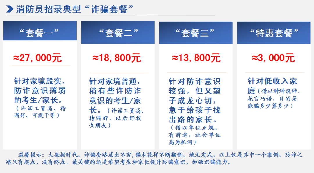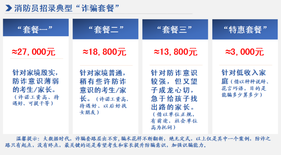 自消防员招录信息发布以来 掀起一阵阵消防员招录的热潮 广大适龄青年怀揣着烈火英雄梦 踊跃报名,积极投身国家消防救援事业 但是 一些不法分子利用消防员招录名额有限 家长送子女参加消防救援队伍心切的心理 以及部分群众对消防员招录政策 和流程不甚了解的现状 以消防救援队伍有熟人、有关系等为谎言 骗取考生及家长的信任 以达到诈骗钱财的目的 提醒:收到此类信息,切勿上当受骗!消防员招录不收取任何费用! 如有疑问,请咨询当地消防救援大队。 案例二 近日有人反映,小张(化名)从网上找到关系人,说花钱可以进入国家队,小张因为体能不好,就向中介关系人缴纳2万元所谓辛苦费,然后中介关系人就不知去向,电话不接,微信不回,只好向公众号求助。 提醒:渠道花钱可以进入国家队,说的信誓旦旦,切勿轻信,现在骗子比较多,凡是涉及钱的,一定要谨慎。 ↓↓↓ 谎称自己在某消防队里有“局长”“总队长”或“政委”等高级别的亲戚,以有权帮操作和提供特招指标为幌子,骗取招录对象和家长的信任,以需要活动经费为由索要钱财。 谎称在医院或其他部门有内部关系,以可以帮助招录对象顺利通过体检、面试等为借口,骗取钱财。 谎称自己是招录负责人,以能帮助招录对象考消防院校或提干为由,让适龄青年及其家长主动将钱财送给他们。 谎称在消防队有关系,以能够帮助招录对象调换岗位、工作调动为名骗取钱财。 组织诈骗团伙,一人当“托儿”,以花言巧语骗取招录对象及其家长的信任,其他人或冒充消防队干部或充当招录负责人,让适龄青年及其家长主动将钱财送给他们。 以招录名义,针对招录对象开办“训练班”“强化班”,并声称短时间内快速提高考试成绩及招录成功率,向招录对象收取培训费用。 防诈第一式:看服饰 消防救援队伍有严格的纪律规定,无论在单位还是在社会上,消防救援人员的行为举止均受纪律约束。对一些明目张胆到处显摆消防救援人员身份,甚至穿着假“火焰蓝”进行招录、招生、招商,唯恐别人不知道自己是消防救援人员的,一般都是假冒消防救援人员。 消防员招录不向适龄青年及家长收取任何费用。如果有人扬言可花几万元、十几万元甚至更多的钱就可以“进消防”的,或借进消防须缴纳“中介费、赞助费”等名目要钱的,其中必定有诈。另外,招录考核前,消防部门不组织任何形式的考前培训。适龄青年参加招录的全过程不用缴纳任何费用! 消防员招录全国唯一官方平台 网址为: http://xfyzl.119.gov.cn/ 请广大有志青年擦亮眼睛 注意甄别 报考消防员,一定要注意甄别信息发布渠道,并且官方招聘不指定任何考试辅导用书,不举办也不委托任何社会单位和个人举办考试、测试辅导培训和代为报名工作,请有志投身于消防救援工作的朋友们提高警惕,避免信息泄露和上当受骗! 总结下来就是“3个凡是” 凡是包过的,你别信! 凡是收费的,你别信! 凡是非官方的,你别信! |