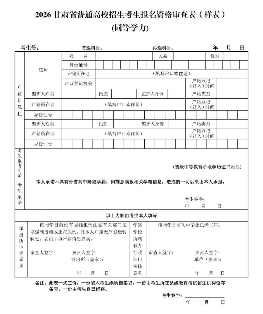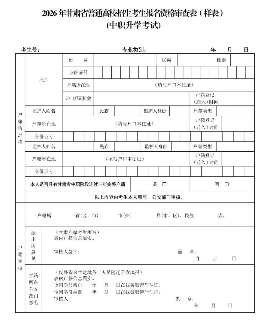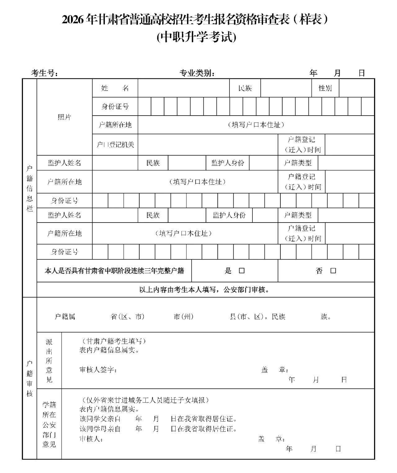 为稳妥做好甘肃省2026年普通高等学校招生统一考试(以下简称“普通高考”)报名工作,根据教育部及我省有关规定,现将我省2026年普通高考报名工作有关事宜通知如下:2026年参加甘肃省普通高校招生的所有考生(包括统考考生、强基计划、高水平运动队、运动训练、武术与民族传统体育专业单独招生、职教师资单独招生、残障生单独招生、保送生、拔尖人才班、消防单招及高等职业教育考试招生综合评价录取和中职升学考试等)均须在规定时间内参加报名并采集相关信息。(一)符合下列条件的人员,可以申请报名参加普通高考(1)具有甘肃省户籍、高中阶段学籍的考生,出生后首次申报户口登记在甘肃(身份证号码前两位为62),无外省迁转记录,可在我省报名参加普通高考。(2)按照教育部《2025年普通高等学校招生工作规定》“进城务工人员及其他非户籍就业人员的随迁子女接受高中阶段教育后在当地参加高考”要求,具有甘肃省户籍,出生后首次申报户口登记在甘肃(身份证号码前两位为62),无外省迁转记录,且父亲或母亲或法定监护人为我省常住户籍,在外省接受高中阶段教育的考生,在接受高中阶段教育省份报名。不符合接受高中阶段教育省份高考报名条件,不能在当地高考报名的考生,须具有外省学籍所在地教育考试招生机构出具的不能参加当地普通高考的证明或相关函件(样见附件5),并持相关人员户籍、学籍所在地教育行政部门出具的学籍、学业水平合格考考试成绩证明及综合评价信息等材料,申请在户籍所在县(市、区)报名参加普通高考。考生及父亲或母亲或法定监护人须对不能参加接受高中阶段教育省份普通高考的证明或相关函件的真实性负责,考生前往户籍所在县(市、区)教育考试招生机构进行资格审核时,签订《在甘外省份接受高中阶段教育考生参加甘肃省普通高考报名诚信承诺书》(见附件6)。(3)外省户籍迁入我省的考生,满足下列条件之一的,可在我省报名参加普通高考。①考生本人在我省初中毕业、具有高中阶段连续三年完整学籍并在学籍学校实际就读的,高考报名时本人须具有我省户籍、其父亲或母亲或法定监护人具有我省户籍。②考生本人具有我省高中阶段连续三年完整学籍并在学籍学校实际就读的,户籍迁入我省时间须满三年(时间截止到2026年8月31日),其父亲或母亲或法定监护人具有我省户籍且满三年(时间截止到2026年8月31日)。(4)进城务工人员随迁子女在我省参加普通高考按照《关于做好进城务工人员随迁子女接受义务教育后在我省参加升学考试工作的实施方案》(甘教厅〔2012〕216号)执行。进城(乡镇,下同)务工人员须在报考地具有合法稳定职业、合法稳定住所(含租赁)并按照国家规定参加社会保险等。①考生本人在我省小学毕业、具有初中连续三年完整学籍、高中阶段连续三年完整学籍并在学籍学校实际就读的,高考报名前,其父亲或母亲须在报考地具有我省合法的居住证,并在报考地缴纳养老保险或医疗保险。②考生本人在我省初中毕业、具有高中阶段连续三年完整学籍并在学籍学校实际就读的。其父亲或母亲须在报考地具有我省合法的居住证且居住时间满三年(时间截止到2026年8月31日),并在报考地缴纳养老保险或医疗保险满三年。③考生本人具有我省高中连续三年完整学籍并在学籍学校实际就读的,其父母双方须在报考地具有我省合法的居住证,且居住时间满三年(时间截止到2026年8月31日),并在报考地缴纳养老保险或医疗保险满三年。满足上述条件之一的随迁子女考生可在学籍所在地参加高考报名,往届高中毕业随迁子女,能够继续提供父亲或母亲居住证与缴纳保险材料,上一年度在我省参加普通高考的,可继续在我省参加高考报名。不符合相关条件的考生回户籍所在省报名参加考试。(5)在考生高中就读阶段,考生父亲或母亲军转安置或工作调动(国家机关、事业单位、驻甘部队现役军人(含文职人员)、国有企业人事管理部门办理的调动)至我省,考生同时迁转常住户籍与高中阶段学籍至我省,并在学籍学校实际就读的,出具相关证明后,可不受户籍、学籍年限限制。我省当年高考报名结束后,不再受理此类考生的报名申请。(6)考生作为被收养人,户籍已迁入收养人名下,考生持有民政部门出具的有效证明,收养人具有我省户籍且满三年(时间截止到2026年8月31日),考生本人具有我省高中阶段连续三年完整学籍并在学籍学校实际就读。①具有甘肃省户籍,出生后首次申报户口登记在甘肃(身份证号码前两位为62),无外省迁转记录,具有我省中等职业学校(含中师、职业中专(职业高中)、成人中专、技工学校,下同)学籍的应往届毕业生可报名参加中职升学考试,也可报名参加普通高考。②具有甘肃省户籍,出生后首次申报户口登记在甘肃(身份证号码前两位为62),无外省迁转记录,且父亲或母亲或法定监护人为我省常住户籍的非我省中等职业学校学籍的中职毕业生,不得报名参加中职升学考试,但可报名参加普通高考。③户籍迁入我省具有我省中职学校学籍并在学籍学校实际就读的考生,符合户籍迁入我省报名条件的,可报名参加中职升学考试,也可报名参加普通高考。④非我省户籍,具有我省中等职业学校学籍并在学籍学校实际就读,且符合进城务工人员随迁子女条件的中职生,可报考中职升学考试或报名参加普通高考。⑤非