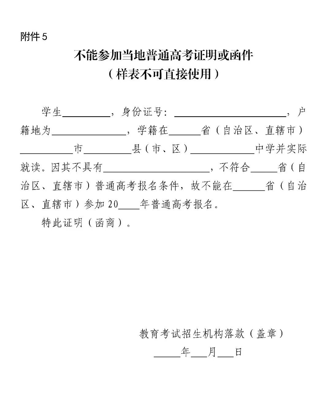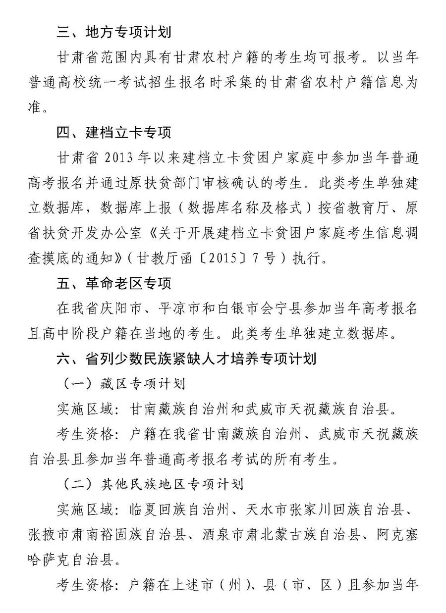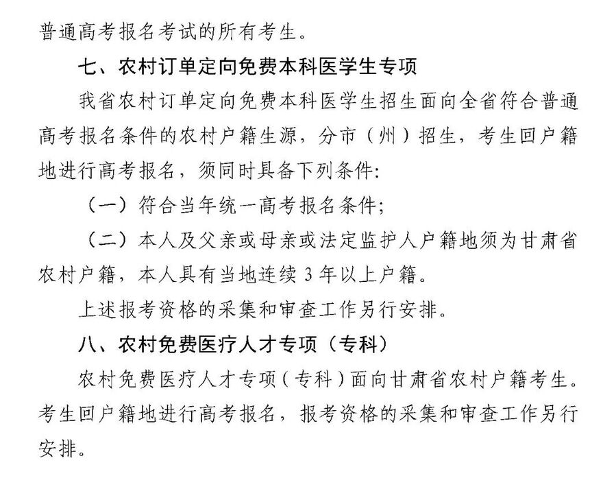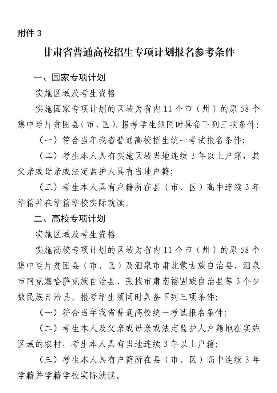 为稳妥做好甘肃省2026年普通高等学校招生统一考试(以下简称“普通高考”)报名工作,根据教育部及我省有关规定,现将我省2026年普通高考报名工作有关事宜通知如下:2026年参加甘肃省普通高校招生的所有考生(包括统考考生、强基计划、高水平运动队、运动训练、武术与民族传统体育专业单独招生、职教师资单独招生、残障生单独招生、保送生、拔尖人才班、消防单招及高等职业教育考试招生综合评价录取和中职升学考试等)均须在规定时间内参加报名并采集相关信息。(一)符合下列条件的人员,可以申请报名参加普通高考(1)具有甘肃省户籍、高中阶段学籍的考生,出生后首次申报户口登记在甘肃(身份证号码前两位为62),无外省迁转记录,可在我省报名参加普通高考。(2)按照教育部《2025年普通高等学校招生工作规定》“进城务工人员及其他非户籍就业人员的随迁子女接受高中阶段教育后在当地参加高考”要求,具有甘肃省户籍,出生后首次申报户口登记在甘肃(身份证号码前两位为62),无外省迁转记录,且父亲或母亲或法定监护人为我省常住户籍,在外省接受高中阶段教育的考生,在接受高中阶段教育省份报名。不符合接受高中阶段教育省份高考报名条件,不能在当地高考报名的考生,须具有外省学籍所在地教育考试招生机构出具的不能参加当地普通高考的证明或相关函件(样见附件5),并持相关人员户籍、学籍所在地教育行政部门出具的学籍、学业水平合格考考试成绩证明及综合评价信息等材料,申请在户籍所在县(市、区)报名参加普通高考。考生及父亲或母亲或法定监护人须对不能参加接受高中阶段教育省份普通高考的证明或相关函件的真实性负责,考生前往户籍所在县(市、区)教育考试招生机构进行资格审核时,签订《在甘外省份接受高中阶段教育考生参加甘肃省普通高考报名诚信承诺书》(见附件6)。(3)外省户籍迁入我省的考生,满足下列条件之一的,可在我省报名参加普通高考。①考生本人在我省初中毕业、具有高中阶段连续三年完整学籍并在学籍学校实际就读的,高考报名时本人须具有我省户籍、其父亲或母亲或法定监护人具有我省户籍。②考生本人具有我省高中阶段连续三年完整学籍并在学籍学校实际就读的,户籍迁入我省时间须满三年(时间截止到2026年8月31日),其父亲或母亲或法定监护人具有我省户籍且满三年(时间截止到2026年8月31日)。(4)进城务工人员随迁子女在我省参加普通高考按照《关于做好进城务工人员随迁子女接受义务教育后在我省参加升学考试工作的实施方案》(甘教厅〔2012〕216号)执行。进城(乡镇,下同)务工人员须在报考地具有合法稳定职业、合法稳定住所(含租赁)并按照国家规定参加社会保险等。①考生本人在我省小学毕业、具有初中连续三年完整学籍、高中阶段连续三年完整学籍并在学籍学校实际就读的,高考报名前,其父亲或母亲须在报考地具有我省合法的居住证,并在报考地缴纳养老保险或医疗保险。②考生本人在我省初中毕业、具有高中阶段连续三年完整学籍并在学籍学校实际就读的。其父亲或母亲须在报考地具有我省合法的居住证且居住时间满三年(时间截止到2026年8月31日),并在报考地缴纳养老保险或医疗保险满三年。③考生本人具有我省高中连续三年完整学籍并在学籍学校实际就读的,其父母双方须在报考地具有我省合法的居住证,且居住时间满三年(时间截止到2026年8月31日),并在报考地缴纳养老保险或医疗保险满三年。满足上述条件之一的随迁子女考生可在学籍所在地参加高考报名,往届高中毕业随迁子女,能够继续提供父亲或母亲居住证与缴纳保险材料,上一年度在我省参加普通高考的,可继续在我省参加高考报名。不符合相关条件的考生回户籍所在省报名参加考试。(5)在考生高中就读阶段,考生父亲或母亲军转安置或工作调动(国家机关、事业单位、驻甘部队现役军人(含文职人员)、国有企业人事管理部门办理的调动)至我省,考生同时迁转常住户籍与高中阶段学籍至我省,并在学籍学校实际就读的,出具相关证明后,可不受户籍、学籍年限限制。我省当年高考报名结束后,不再受理此类考生的报名申请。(6)考生作为被收养人,户籍已迁入收养人名下,考生持有民政部门出具的有效证明,收养人具有我省户籍且满三年(时间截止到2026年8月31日),考生本人具有我省高中阶段连续三年完整学籍并在学籍学校实际就读。①具有甘肃省户籍,出生后首次申报户口登记在甘肃(身份证号码前两位为62),无外省迁转记录,具有我省中等职业学校(含中师、职业中专(职业高中)、成人中专、技工学校,下同)学籍的应往届毕业生可报名参加中职升学考试,也可报名参加普通高考。②具有甘肃省户籍,出生后首次申报户口登记在甘肃(身份证号码前两位为62),无外省迁转记录,且父亲或母亲或法定监护人为我省常住户籍的非我省中等职业学校学籍的中职毕业生,不得报名参加中职升学考试,但可报名参加普通高考。③户籍迁入我省具有我省中职学校学籍并在学籍学校实际就读的考生,符合户籍迁入我省报名条件的,可报名参加中职升学考试,也可报名参加普通高考。④非我省户籍,具有我省中等职业学校学籍并在学籍学校实际就读,且符合进城务工人员随迁子女条件的中职生,可报考中职升学考试或报名参加普通高考。⑤非