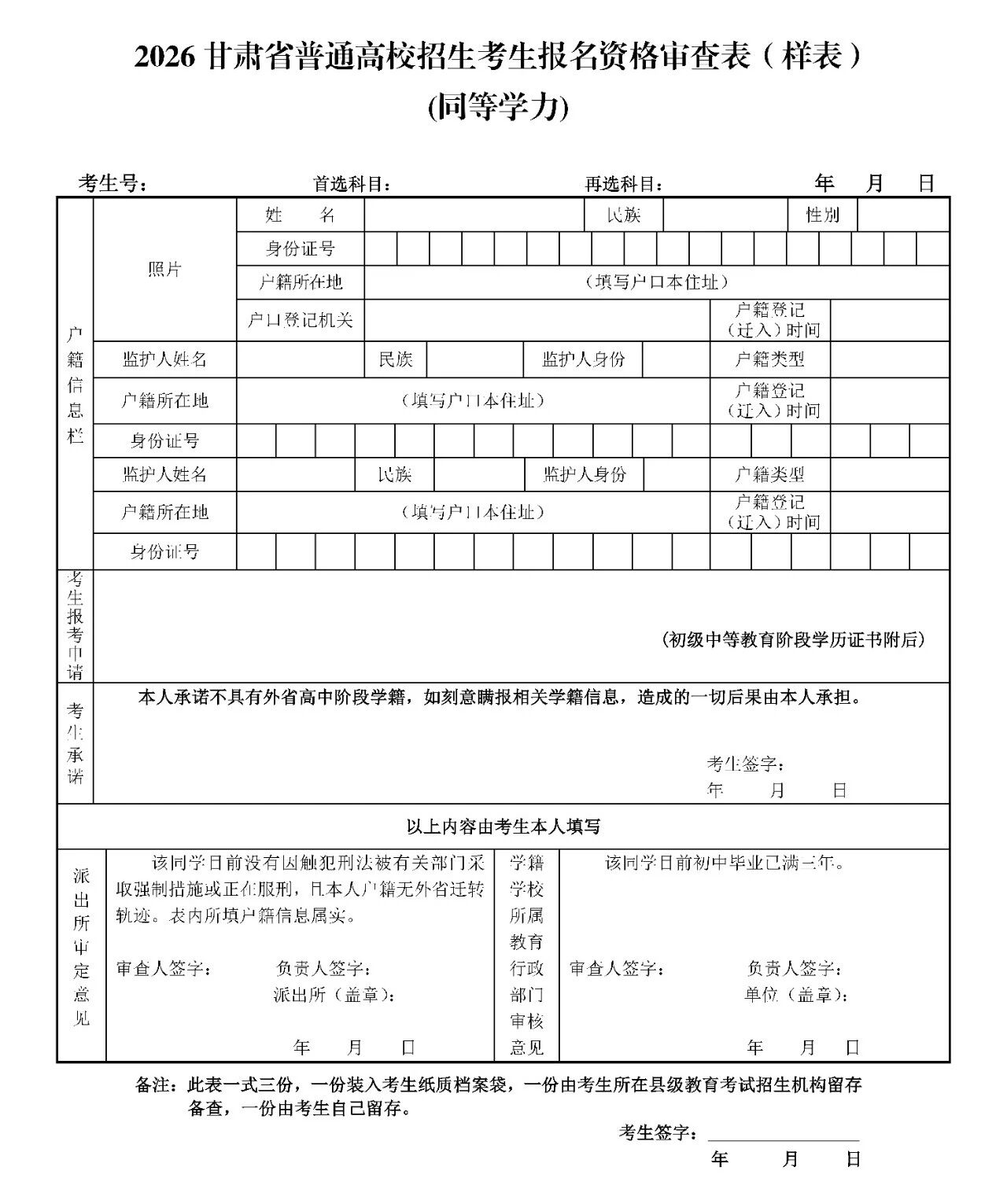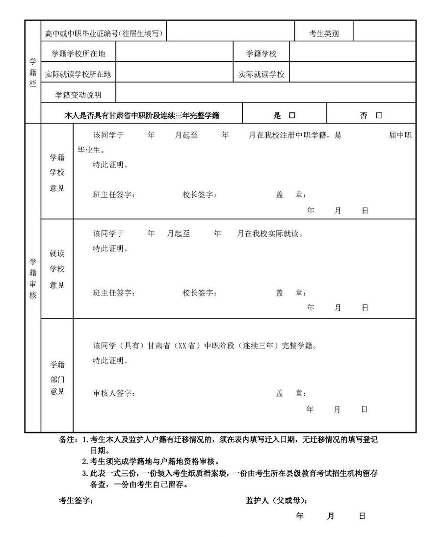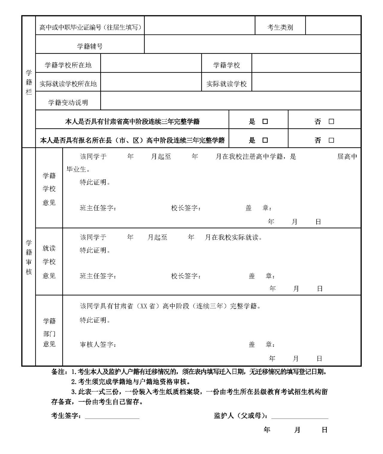 2.甘肃省普通高校招生考生报名资格审查表(样表)