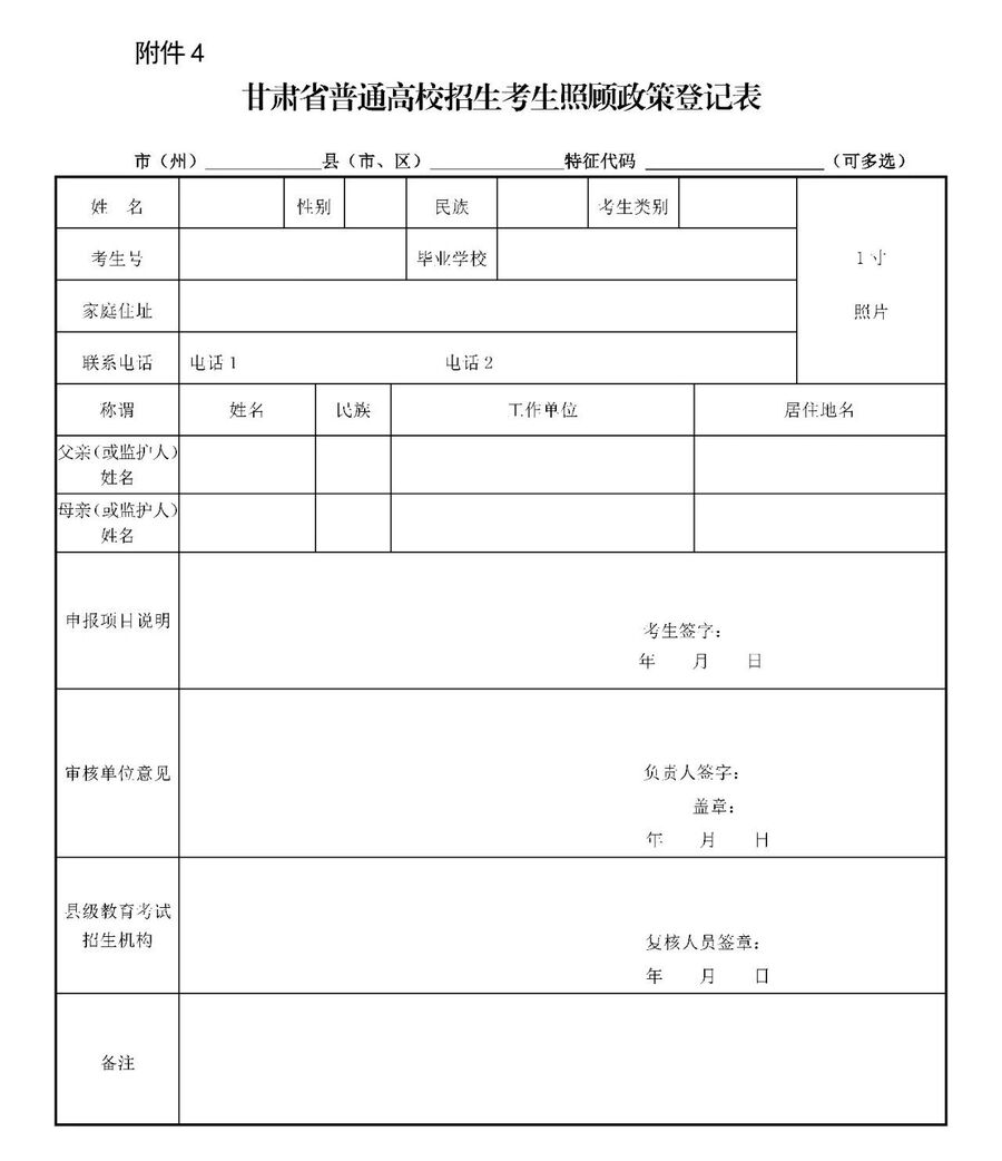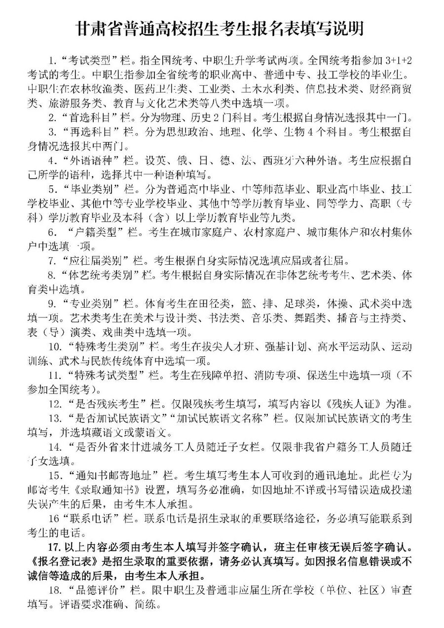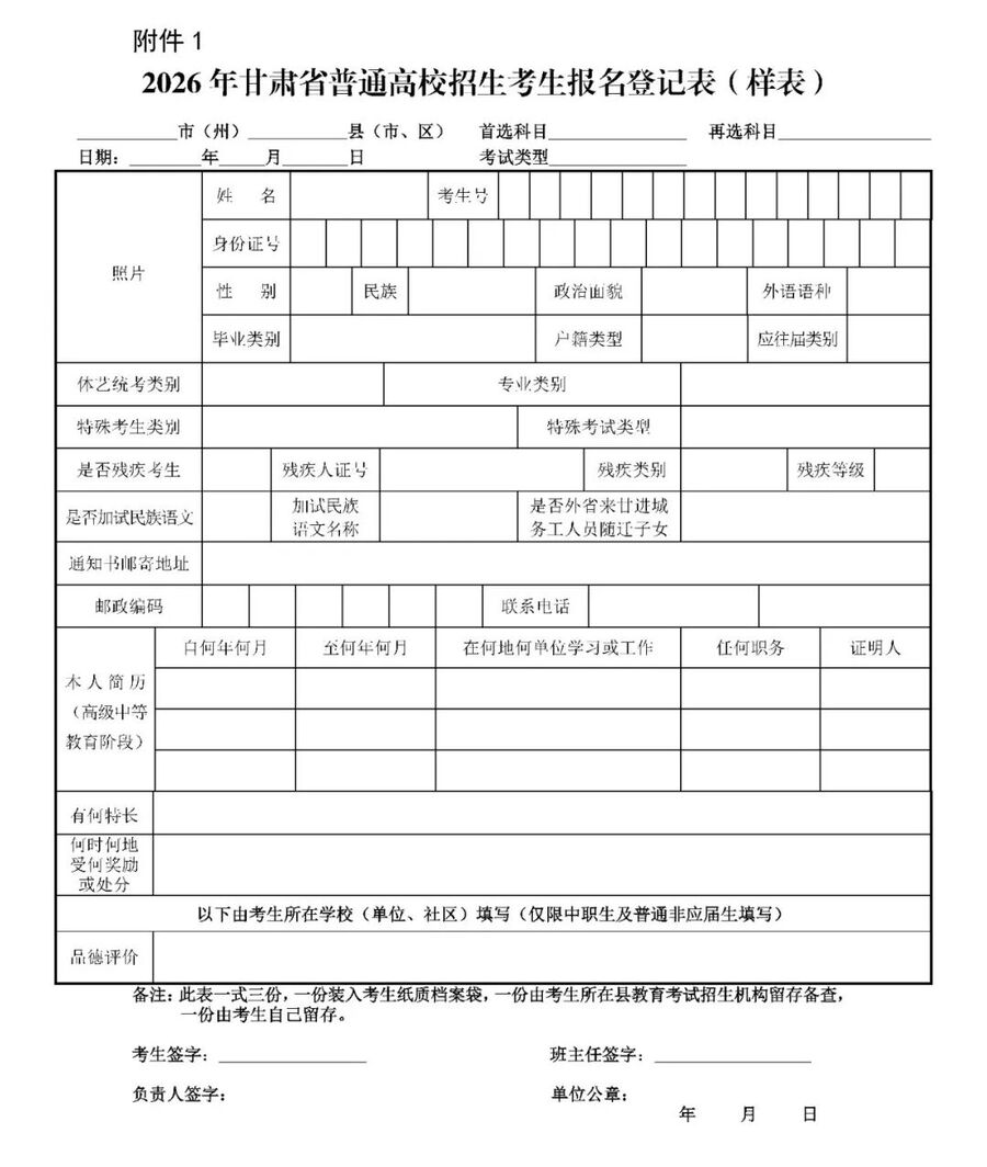 附件:1.甘肃省普通高校招生考生报名登记表(样表)