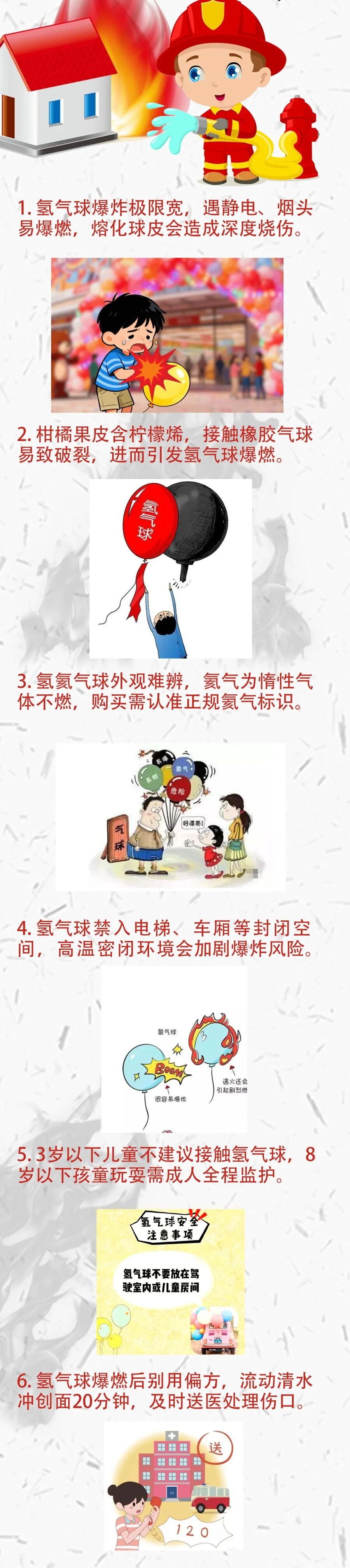 氢气球消防安全指南 街头飘着的卡通气球,是孩子眼中的“快乐魔法”,但如果填充的是氢气,就可能变成“移动炸弹”。近期多地发生氢气球爆燃伤人事件,这份浓缩版安全指南,帮你守住安全底线! 先搞懂:氢气球的 致命隐患 爆炸门槛极低:氢气在空气中混入4%-75%就可能爆炸,衣物摩擦的静电、未熄灭的烟头都能引燃。 燃烧温度极高:爆燃瞬间温度可达3000℃,熔化的球皮会黏附皮肤,造成深度烧伤 。 隐形诱因暗藏:柑橘类水果果皮的柠檬烯,会腐蚀橡胶气球导致破裂爆燃。 外观难以分辨:和安全的氦气球长得一模一样,仅凭眼睛根本无法区分。 记牢了:氢气球的安全防护要点 购买要“避雷”:拒绝街头地摊的低价飘浮气球,优先选正规商超标注“氦气”的产品。 使用有“禁区”:不进电梯、车内等封闭空间,远离厨房、打火机、暖气等火源高温区 。 监护不松懈:不给3岁以下孩子买,8岁以下需成人全程看着,不把气球系在孩子手腕或衣服上 。 应急有“妙招”:爆燃后用12-25℃流动清水冲烧伤处20分钟,剪开粘连衣物,严禁涂酱油、牙膏,立即送医。 ! 气球带来的快乐很短暂,但安全永远最重要!转发给身边家长,一起远离氢气球隐患,让孩子的快乐没有风险~ ! 冬季起火多因干燥易燃,牢记“先控火、再撤离、早报警”,才能在紧急时刻护好自己和家人安全! 白银消防提醒您: 氢气球隐患猛于虎 远离柑橘果皮 烧伤牢记冲脱盖送四步法 |
