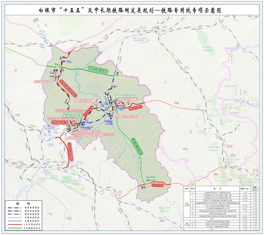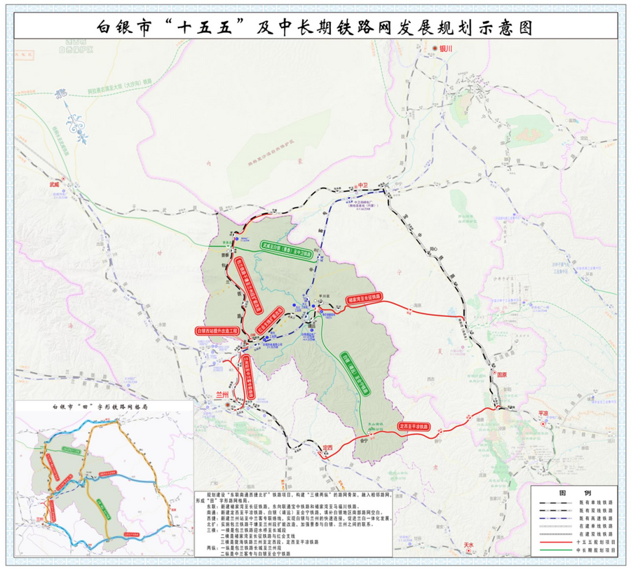 白银市人民政府办公室 2025年8月8日 (此件公开发布,有删减) 白银市“十五五”及中长期铁路网发展规划 铁路是关系国计民生的重要基础设施,在经济社会发展中的地位和作用至关重要。为科学合理规划我市“十五五”及中长期铁路建设,依据《国家综合立体交通网规划纲要》(中发〔2021〕5号)、国家《中长期铁路网规划》(发改基础〔2016〕1536号)和《甘肃省“十四五”及中长期铁路网发展规划》(甘发改交运〔2021〕755号)、《甘肃省铁路专用线发展规划(2025—2030年)》(甘发改基础〔2024〕846号),结合我市实际,制定本规划。 “十五五”规划期为2026-2030年,中长期展望到2045年。 一、规划基础 (一)社会经济发展现状 1.地理位置及区划人口概况。我市位于甘宁蒙三省交汇处,东西宽147.75公里,南北长249.25公里,总面积2.01万平方公里。北接内蒙古自治区,南连定西市,东与平凉市及宁夏回族自治区中卫市、固原市接壤,西邻兰州市及武威市,距省会兰州市69公里,距中川国际机场40公里。现辖会宁县、靖远县、景泰县和白银区、平川区,2024年常住人口148.01万人,其中城镇人口90.01万人,占比60.81%;农村人口58万人,占比39.19%。 2.产业结构及经济发展概况。2024年,全市地区生产总值完成742.87亿元,其中:第一产业增加值123.06亿元,第二产业增加值286.08亿元,第三产业增加值333.73亿元,三次产业结构比为16.6∶38.5∶44.9;全市全部工业增加值完成228.53亿元;全市社会消费品零售总额实现218亿元;全市城镇居民人均可支配收入完成41586元,农村居民人均可支配收入完成14783元。 (二)综合交通发展现状 1.铁路发展现状。“十四五”时期,中兰客运专线正式开通运营,标志着我市正式接入全国高速铁路网,结束了不通高铁的历史。截至2024年底,我市共有包兰铁路、干武铁路、中兰客运专线三条国铁干线和红会支线一条地方铁路,线路总里程385.5公里,其中:普速铁路255.3公里,高速铁路130.2公里,路网密度191.8公里/万平方公里,电化率70.4%,复线率35.5%。铁路专用线22条,线路总里程255.1公里。 2.公路发展现状。“十四五”时期,我市积极推进高速公路、普通国省干线和农村公路建设,实现了5个县区全部通高速公路,69个乡镇全部通油路,702个行政村全部通水泥(沥青)路,公路网“外联、内畅、互通”程度不断增强。截至2024年底,公路总里程12404.8公里,其中:高速公路322.77公里,一级公路132.97公里,二级公路926.27公里,三级公路724.61公里,四级及以下公路10298.18公里。 3.航空发展现状。“十四五”时期,白银通用机场建成并投入使用,成为国家电网在西北地区布局的首个直升机电力作业基地,也是我市首个通用航空枢纽。建成白银景泰黄河石林临时起降点,为黄河石林空中游览等商业飞行提供直升机服务。 白银市铁路现状统计表