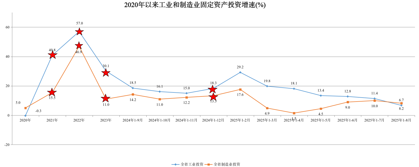 一、工业固定资产投资完成情况 2025年1-8月,全省工业固定资产投资同比增长6.7%,低于全国平均水平(7.7%)1个百分点,低于调度目标(10%)3.3个百分点,位居全国第20位,增幅较上年同期回落11.4个百分点,较2025年1-7月回落4.7个百分点。 (一)分行业投资情况 制造业投资增长8.2%,增幅较上年同期回落5.4个百分点,较2025年1-7月回落1.8个百分点。采矿业投资增长2.4%,较上年同期回落30.5个百分点,较2025年1-7月回落0.8个百分点。电力、热力、燃气及水的生产和供应业投资增长6.7%,增幅较上年同期回落11.5个百分点,较2025年1-7月回落7.1个百分点。 (二)分市州投资情况 10个市州工业固定资产投资实现正增长,其中:6个市州工业固定资产投资增幅超全省平均水平,分别为白银市(50.3%)、陇南市(29.3%)、天水市(24.8%)、定西市(24.4%)、兰州市(18.9%)、甘南州(10.8%);4个市州工业固定资产投资增幅低于全省平均水平,分别为庆阳市(4.1%)、金昌市(2.3%)、酒泉市(2.0%)、武威市(1.6%)。4个市州工业固定资产投资负增长,平凉市(-16.6%)、临夏州(-7.4%)、张掖市(-6.5%)、嘉峪关市(-1.2%)。 与2025年1-7月投资增速相比,4个市州工业固定资产投资增速有所提高,其中:甘南州提高6.5个百分点,庆阳市提高1.3个百分点,临夏州提高0.2个百分点,白银市提高0.2个百分点。10个市州工业固定资产投资增速回落,其中:定西市回落35.6个百分点,平凉市回落9.4个百分点,兰州市回落4.0个百分点,武威市回落2.5个百分点,嘉峪关市回落1.4个百分点,天水市回落1.3个百分点,酒泉市回落1.1个百分点,金昌市回落0.6个百分点,张掖市回落0.4个百分点,陇南市回落0.1个百分点。 与上年同期投资增速相比,4个市州工业固定资产投资增速有所提高,其中:甘南州提高48个百分点,兰州市提高11.6个百分点,酒泉市提高10.5个百分点,金昌市提高0.2个百分点。10个市州工业固定资产投资增速回落,其中:平凉市回落81.2个百分点,临夏州回落68.3个百分点,庆阳市回落36.8个百分点,天水市回落30.9个百分点,陇南市回落30.9个百分点,武威市回落29.5个百分点,张掖市回落11.3个百分点,白银市回落7.6个百分点,定西市回落5.2个百分点,嘉峪关市回落4.3个百分点。 二、重点项目建设情况 (一)500万元以上工业和信息化项目情况 2025年全省实施工业和信息化项目共1217项,总投资8974亿元,当年计划投资2042亿元。1-8月,1160个项目开工建设,完成投资1320亿元,投资完成率64.6%。 其中,省级重点调度50亿以上重大项目40个,总投资3962亿元,当年计划投资669亿元。1-8月,31个项目开工建设,完成投资 410亿元,投资完成率 61.2%。 (二)产业链项目情况 我厅监测的7个重点产业链项目151项,总投资2670亿元,当年计划投资637亿元。1-8月, 140个项目开工建设,完成投资315亿元,投资完成率49.5%。其中:24个石化化工产业链项目完成投资95.3亿元,40个冶金有色产业链项目完成投资 71.6亿元,23个新材料产业链项目完成投资75.4 亿元,16个生物制药产业链项目完成投资 15.7亿元,16个装备制造产业链项目完成投资14.4亿元,22个电子产业链项目完成投资 31.2亿元,10个信息产业链项目完成投资11.5亿元。 (三)“三化”改造项目情况 我厅监测的304项“三化”改造重点项目总投资1184亿元,当年计划投资258亿元。1-8月,293个项目开工建设,完成投资168亿元,投资完成率65.3%。其中:63个高端化项目完成投资22.5亿元;105个智能化项目完成投资77.9亿元;136个绿色化项目完成投资67.9亿元。 |
