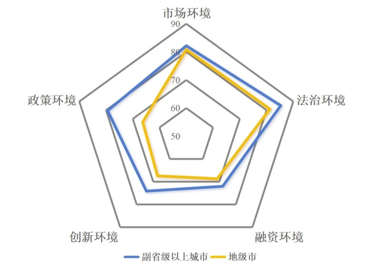 2024年度中小企业发展环境评估报告 中小企业联系千家万户,是推动创新、促进就业、改善民生的重要力量。习近平总书记多次对中小企业工作作出重要指示批示,要求“各级党委和政府要坚决贯彻落实党中央决策部署,为中小企业发展营造良好环境”。为深入贯彻落实党中央、国务院决策部署,优化中小企业发展环境,激发中小企业发展活力,按照《中华人民共和国中小企业促进法》有关要求,2024年,中国中小企业发展促进中心继续开展中小企业发展环境评估工作,形成评估报告。有关情况如下: 一、评估工作情况 一是聚焦落实促进中小企业发展工作新要求新部署,完善评估指标体系。为全面贯彻党中央、国务院的决策部署,落实党的二十届三中全会有关要求,本次评估在保持“市场环境、法治环境、融资环境、创新环境、政策环境”5个维度为核心的指标体系总体稳定基础上,对部分三级指标调整优化。指标体系由5个一级指标,24个二级指标,41个三级指标构成。 二是多渠道获取评估数据,深入了解企业对发展环境的真实反馈。本次评估通过组织50个参评城市报送相关情况,对企业开展网上调查,选取部分城市开展实地调研,引用和加工权威机构数据等方式,确保评估结果全面、真实、有效。共收集有效问卷5万余份,通过大量实地面对面座谈,深入了解企业对发展环境的真实反馈。 三是全方位多角度深入分析,切实发挥评估工作促进效用。充分利用评估过程中收集的数据,从城市能级、区域及行业等多个角度,深入分析中小企业发展环境真实情况、主要特征。同时加强案例分析,充分体现评估工作开展以来取得的成效,为各参评城市进一步优化中小企业发展环境提供借鉴参考。 二、评估主要结论 (一)参评城市发展环境基本特征 2024年度评估显示,我国中小企业发展环境总体持续优化,大部分城市发展环境较上年呈现不同程度的改善,但不同区域、城市、行业之间仍存在一定差异,主要体现在: 1. 市场环境整体表现较为均衡,全国统一大市场建设成效显现 从5大类环境看,各参评城市的市场环境得分离散度最低,反映出各城市在市场环境上的差距持续缩小。从不同区域、不同能级城市表现来看,东、中、西部及东北地区城市,以及副省级以上城市和地级市在市场环境上的得分最为接近,整体表现均衡。近年来,各参评城市深入落实市场准入负面清单制度,推动公平竞争审查,着力破除各种隐性壁垒,加大力度推进“高效办成一件事”。问卷数据显示,九成以上企业在市场准入、要素保障、政务服务等方面均表示满意。同时,各参评城市深入推进社会信用体系建设,推动信用服务实体经济,44个参评城市的综合信用指数较上年有所提升。整体来看,随着全国统一大市场建设持续深入推进,中小企业市场环境优化成效显著。 图1 参评城市综合得分及各项一级指标得分离散系数 2. 副省级以上城市领跑,地级市潜力持续释放 评估结果显示,副省级以上城市综合优势突出,在全部参评城市综合排名前10位中占据9席,且各项一级指标得分均值皆高于地级市参评城市。其中,在创新环境和政策环境两个方面的优势最为明显,19个副省级城市拥有的国家级创新载体数量占50个参评城市总数的55%,新增发明专利授权量占总数的76.52%,技术合同成交额占总数的82.07%;超七成副省级以上城市已设立专门的中小企业发展基金,比地级市高出五成,副省级以上城市中小企业公共服务机构区县覆盖率均值达82.03%,比地级市高出21.36个百分点。同时,部分地级市实现差异化突围,苏州、无锡、合肥、金华、长沙、东莞依托自身资源禀赋和产业优势,持续优化中小企业发展环境,充分释放发展潜力,成功跻身参评城市前20。但大部分地级市在营造创新生态、获取政策资源等方面仍存在一定短板,潜力有待进一步释放。 图2 不同行政级别参评城市各项一级指标得分均值雷达图 3. 东部地区发展环境全面领先,其他地区追赶提速 评估结果显示,东部参评城市各项一级指标得分均值领先其他区域,参评城市中综合得分排名前10位均为东部城市,其中长三角地区城市占据半数,上海蝉联排名第一。其他地区城市则呈现明显追赶趋势,武汉、成都等城市得分排名位列前15,西安创新环境排名跻身前5,合肥市场环境和融资环境均进入前10。但同时,西部和中部参评城市在政策落实方面仍有较大改进空间,问卷数据显示,反映政策“够不着”(34.15%,31.42%)、“落不了”(37.00%,39.74%)问题的企业占比相对较多,而东北地区企业在保护产权和企业家权益(18.84%)、规范涉企行政执法(17.62%)等方面反映较多。 图3 各区域参评城市一级指标得分均值雷达图 4. 企业营收整体保持稳定,专精特新中小企业韧性更强 问卷数据显示,2024年度中小企业营业收入水平整体保持稳定,反映上升或持平的企业数量达到六成,但企业盈利能力持续承压,反映下降的企业占比较上年度增加9.45个百分点,达到45.09%,增收不增利现象较为明显。专精特新中小企业体现出更强的经营韧性,问卷数据显示,64.69%的专精特新中小企业营业收入与上年相比有所增长或持平,比非专精特新中小企业高出8.09个百分点;专精特新中小企业对未来的预期更好、信心更足,63.98%的企业未来一年有创新研发计划,40.35%的企业有投资计划,比非专精特新中小企业分别高出34.13和17.99个百分点。 图4 各类型企