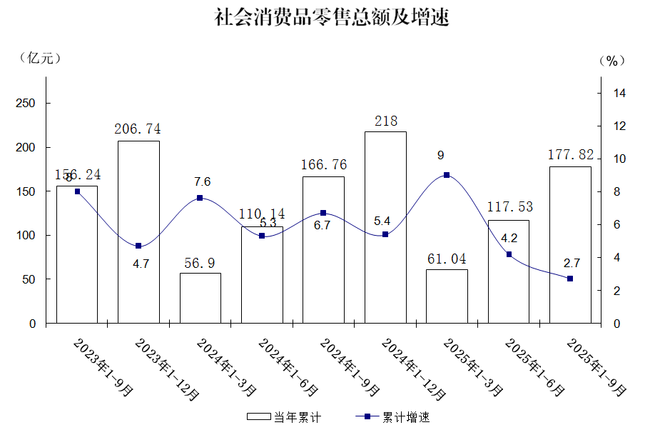 截至9月底,全市在库项目(不含房地产)541个,同比增加29个。其中:续建项目303个,同比增加9个;新入库项目238个,同比增加20个。 四、消费品市场增势趋缓 前三季度,全市社会消费品零售总额实现177.82亿元,同比增长2.7%,比上半年回落1.5个百分点。部分基本生活类和升级类商品增势较好,限额以上单位烟酒类、五金电料类、体育娱乐用品类、文化办公用品类商品零售额分别增长77.4%、69.8%、49.2%、194.1%。